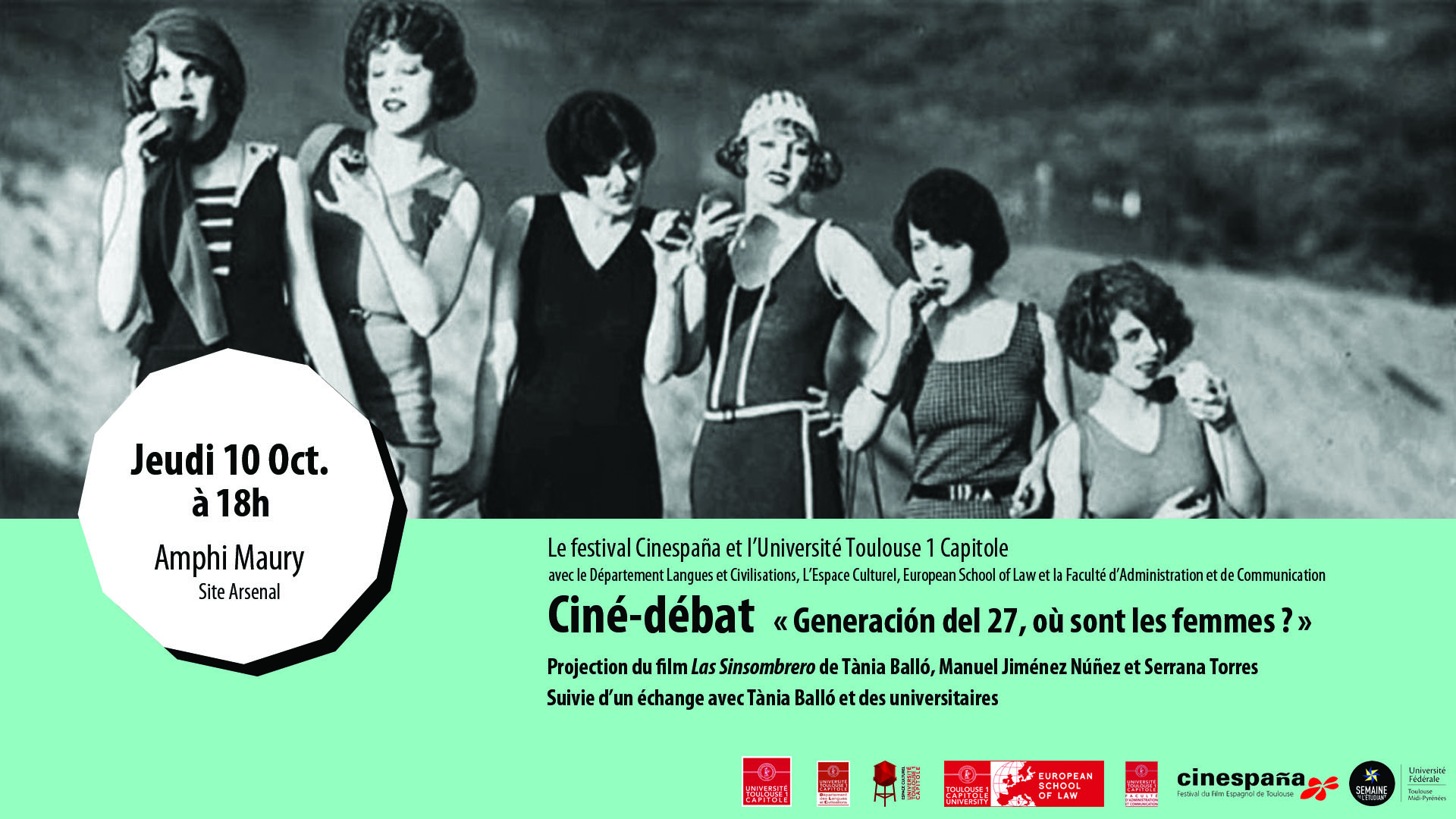 « Generación del 27 : Où sont les femmes ? » Dans le cadre de la 24ème édition de Cinespaña, qui se tiendra du 4 au 13 octobre, l'Université Toulouse Capitole vous propose une projection-débat autour du film "Las Sinsombrero". Un échange avec une des réalisatrices du documentaire clôturera la soirée.