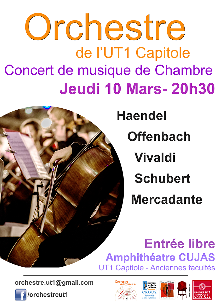 Depuis sa création, l'Orchestre de l'UT1 Capitole développe une forte activité de musique de chambre, notamment pour mener à biens ses partenariats avec d'autres associations ou projets. Mais pour la toute première fois, un concert à l'université est spécialement dédié à ces groupes de musiciens étudiants. Venez nombreux apprécier les pièces qu'ils vous ont préparé !