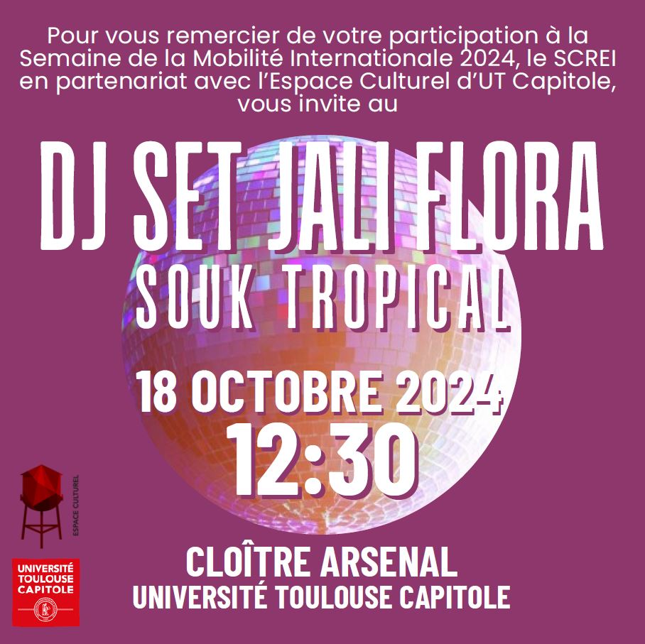 La Semaine de la mobilité internationale se clôture cette année avec Jali Flora qui prendra les platines pour nous faire écouter ses vinyles du monde entier ambiance Souk Tropical !