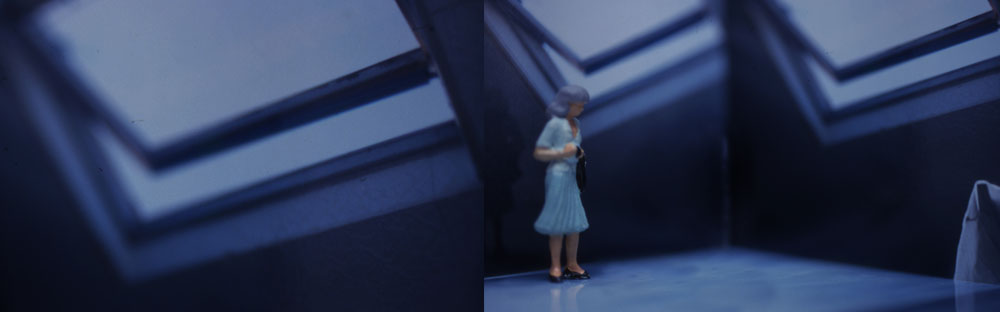 Audrey Mompo met en scène de petites figurines, soldat en action, homme en costume, femme sans âge, dans des décors démesurément vides et flous.