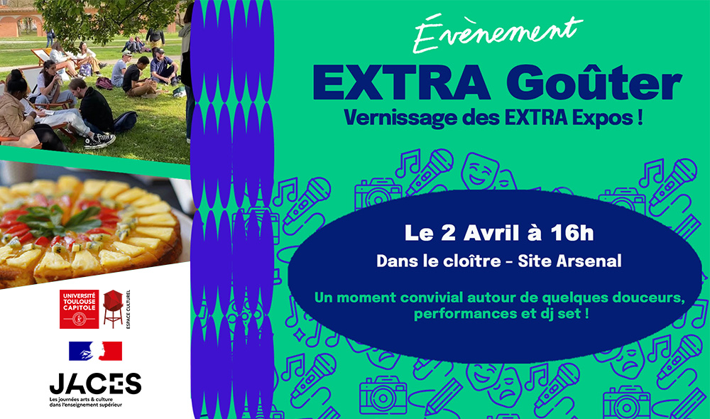 Dans le cadre des EXTRA Expos, événement qui dévoile en images les pratiques artistiques du campus, un EXTRA goûter est prévu pour se retrouver autour de quelques douceurs et en musique.
