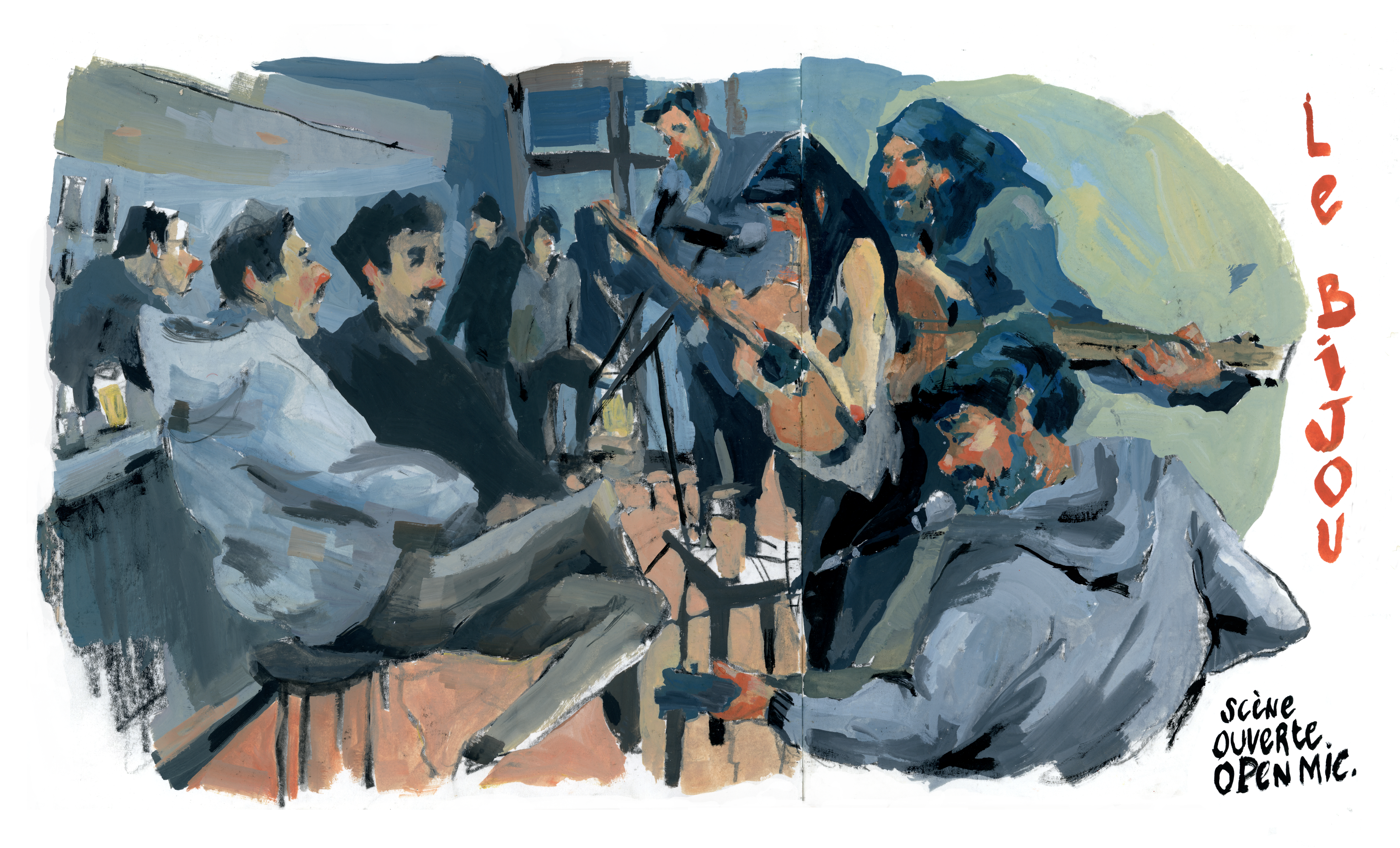 Carnet et crayons, aquarelles ou gouaches toujours avec elle, c’est dans la rue, les cafés, les concerts, les gares ou les métros qu’elle aime capturer sur le vif le banal et le quotidien qui en deviennent, par l’attention portée, exceptionnels.