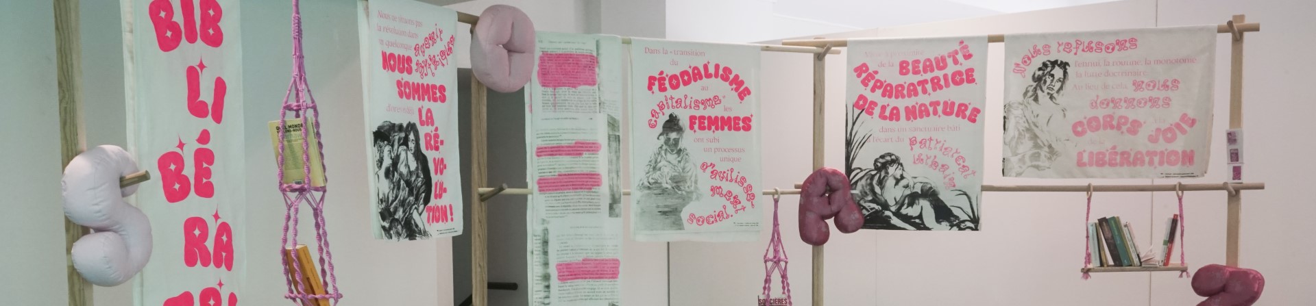 La Biblibératrice est comme un refuge, un espace safe redessiné à l'aide de structures en bois auxquelles sont suspendus des pans de tissus sérigraphiés par l'artiste.