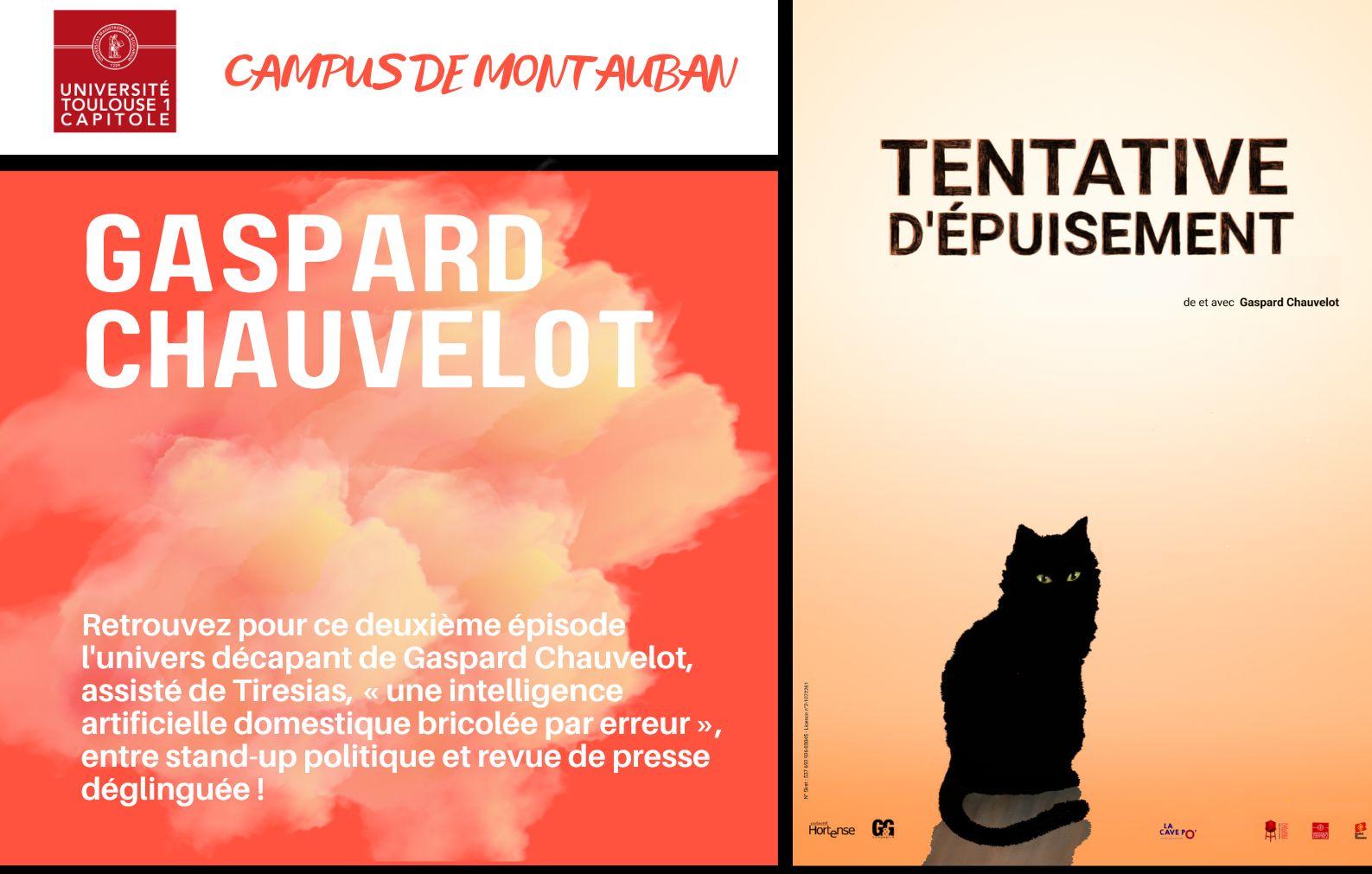 Gaspard Chauvelot est de retour à Montauban, accompagné de son fidèle Tiresias, l'intelligence artificielle domestique bricolée un peu par erreur. L'épisode 2 de la saison 4 de son feuilleton théâtral, entre stand-up et revue de presse, en coproduction avec la Cave Po' et l'Espace Culturel ! est toujours aussi drôle et décapant. Cela devient un rendez-vous coutumier pour l'artiste de venir dans l'amphi accueil à l'heure du déjeuner pour faire rire les étudiants du centre universitaire.
