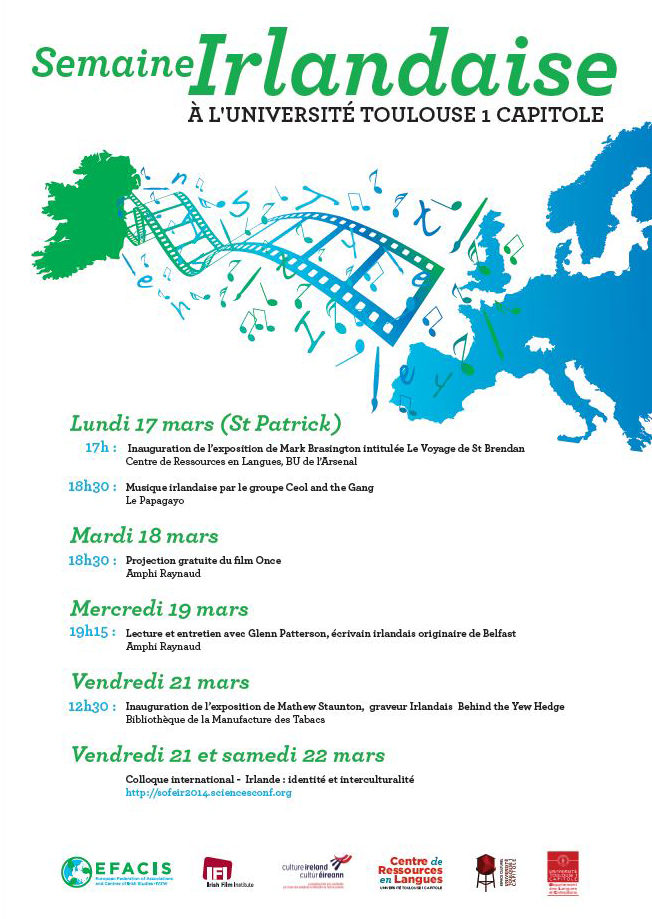 - 18h30 : Projection gratuite du film Once (en collaboration avec l’Irish Itinerary et le ministère irlandais de la culture) à destination des personnels et étudiants d’UT1, Amphi Raynaud, site Arsenal.