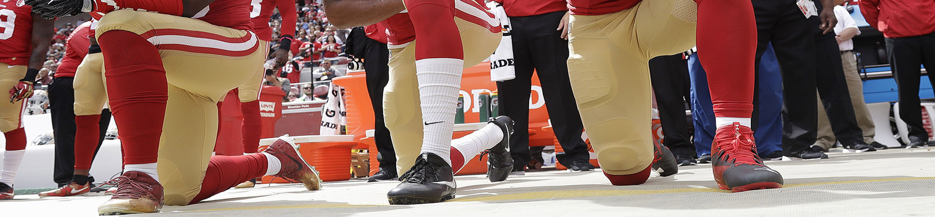 Photo : le 6 octobre 2016, Colin Kaepernick et ses co-équipiers s'agenouillant pendant l'hymne national avant le match de la National Football League pour protester contre les violences policières infligées aux noirs américains.