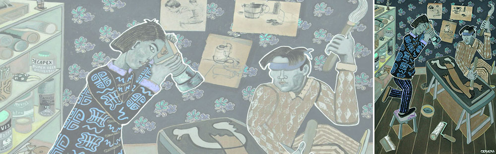 Rattaché à l'école de Sète, André Cervera ne se reconnait pourtant pas dans la Figuration Libre : "Il est vrai que j'ai côtoyé Robert Combas et Hervé Di Rosa, explique t-il. J'ai été imprégné par ces artistes, mais je suis un électron libre ...". A l'image du personnage, sa peinture est une pensée en mouvement, instinctive et sous pression. Elle est à la fois nerveuse et sophistiquée. Toujours remise en question...C'est par l’heureuse ascendance de son grand frère Michel Zoom, « poète de la figuration libre », qu’André Cervera se lance dans la peinture. Après l’École des Beaux Arts de Marseille, il travaille avec rage pour un « art total ». Une pratique quasi tribale dans un style très expressionniste qui rappelle celui de Kokochka ou Ensor, avec le trait noir épais du mouvement Die Brücke, mais s’affirmant de plus en plus « latin » et s’inspirant au fur et à mesure des voyages, de la magie ou de l’animisme des si mal nommés « primitifs ». Ses séries de peintures témoignent de ces croisements. Il recycle des vieux papiers peints, des affiches publicitaires, des dessins académiques. Et, avec la régularité d'un métronome, il dessine, colle, détoure, tamponne, peint, faisant se rencontrer et se juxtaposer les gens, les histoires, les modes de vie et les symboles.
