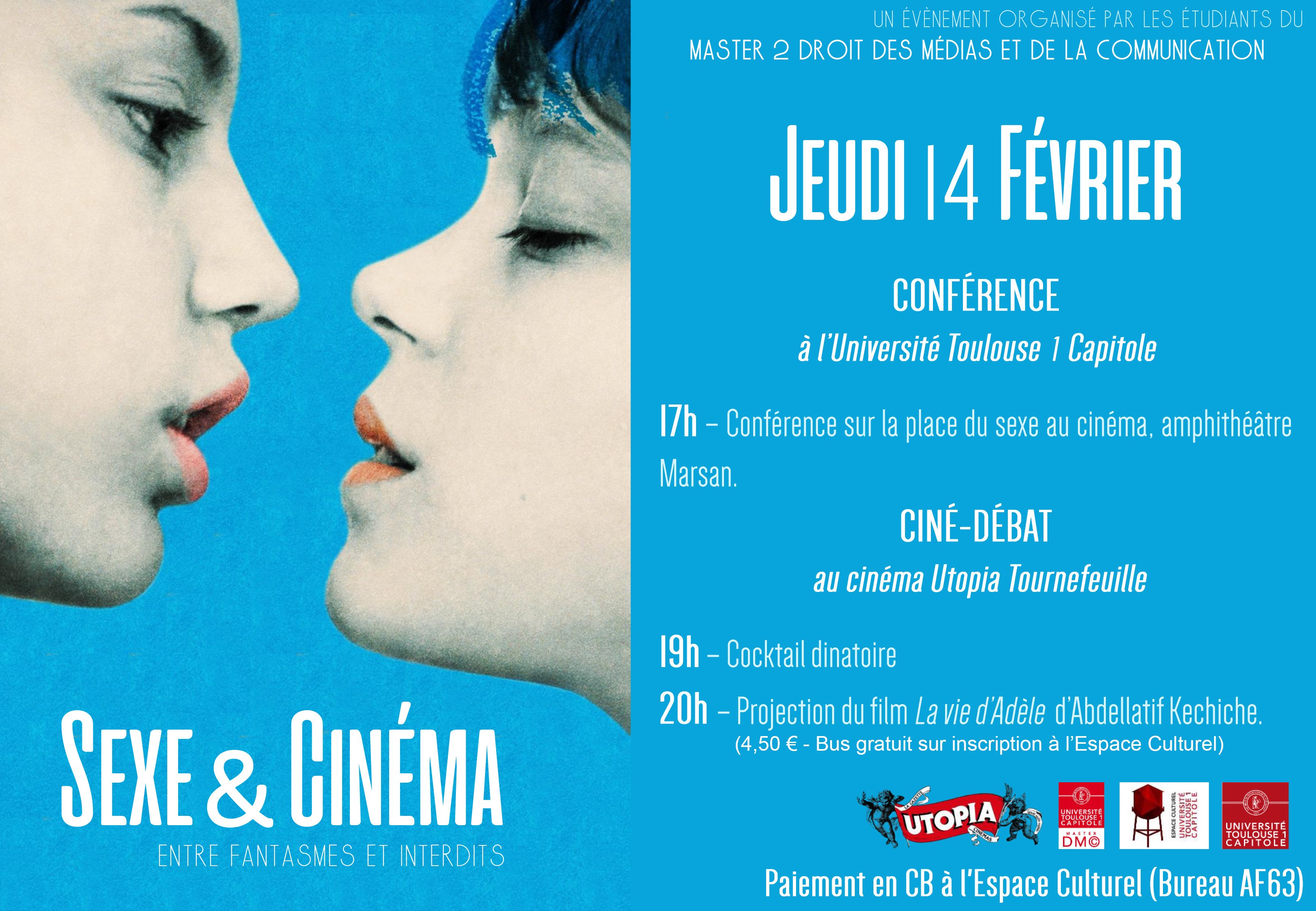 Suite à cette conférence, embarquez à bord d'un bus affrété pour l'occasion qui vous ammènera jusqu'au célèbre cinéma indépendant Utopia à Tournefeuille. Sur place, un accueil autour d'un cocktail dinatoire est prévu avant d'assister à la projection du film La Vie d'Adèle.