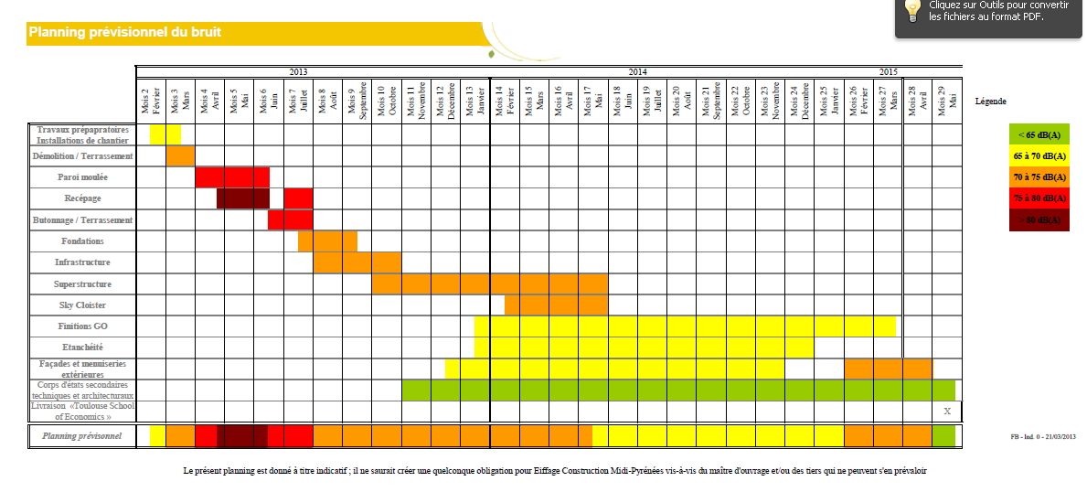 Des travaux d'une telle importance engendrent nécessairement des nuisances sonores. Pour occasionner le moins de gêne possible, tout est mis en oeuvre pour les limiter au strict minimum. Un "planning bruit" a ainsi été établi :