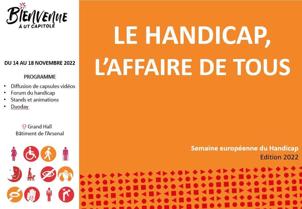 seeph2022 Dans le cadre de la 26ème édition de la Semaine Européenne pour l'Emploi des Personnes Handicapées (SEEPH) du lundi 14 au dimanche 20 novembre 2022, l'Université Toulouse Capitole organise le forum "Le handicap, l'affaire de tous" pour présenter les acteurs de l'université qui se mobilisent tout le long de l'année pour le bien-être des personnes en situation de handicap.