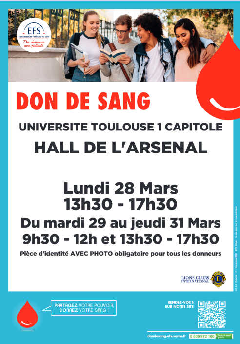 Une collecte est organisée dans le Grand Hall de l'Arsenal de l'Université Toulouse Capitole du lundi 28 au jeudi 31 mars.