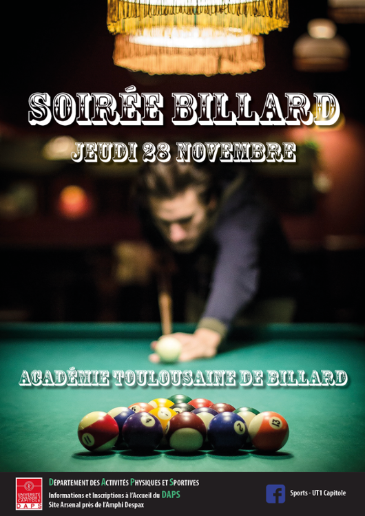 Une soirée Billard aura lieu le jeudi 28 novembre à partir de 20h.