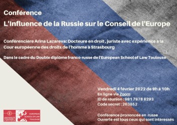 Dans le cadre du Double diplôme franco-russe de la European School of Law Toulouse, ce vendredi 4 février 2022 de 9h à 10h se teindra la conférence L'influence de la Russie sur le Conseil de l’Europe prononcée par la docteure en droit Arina Lazareva.