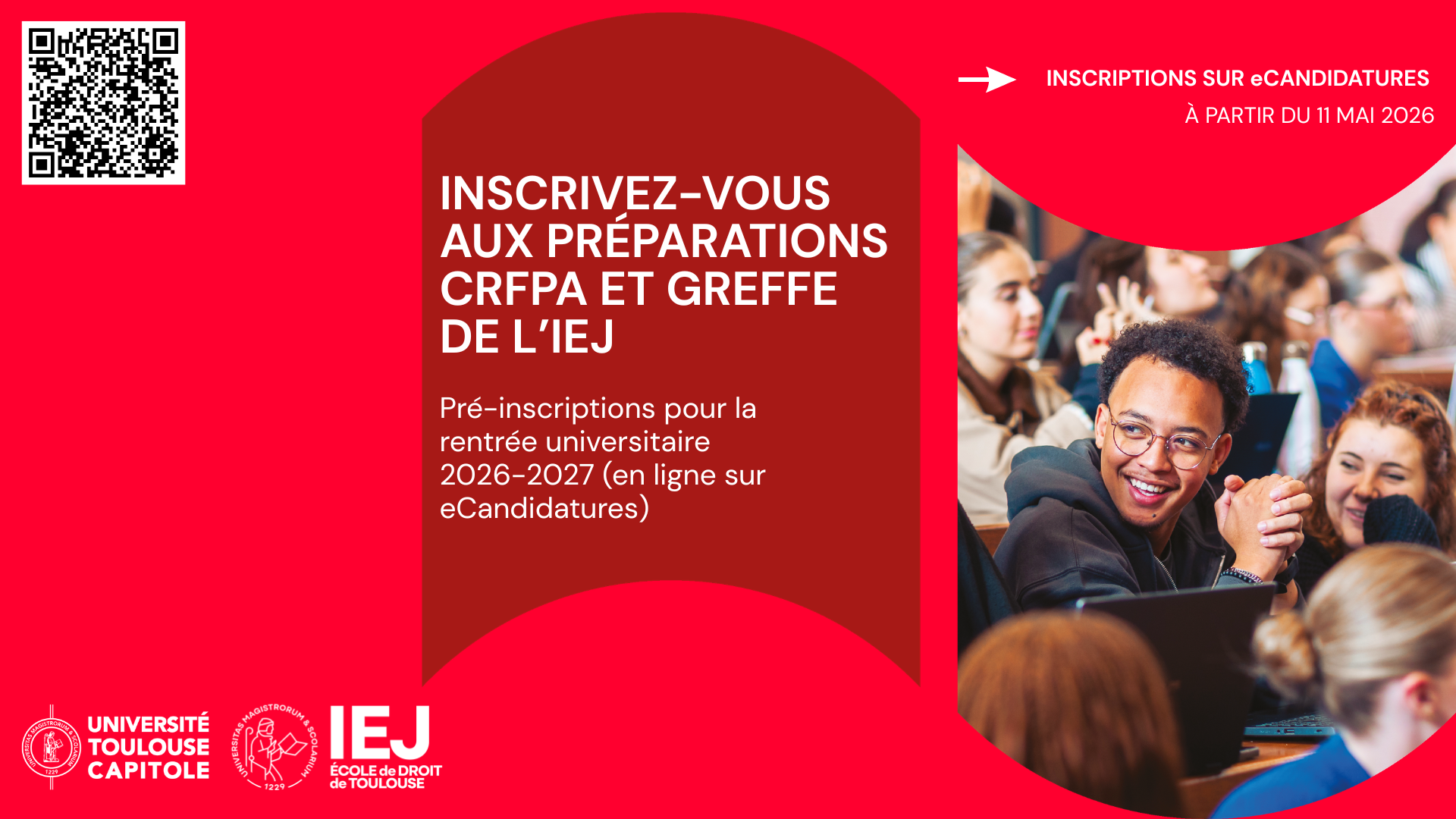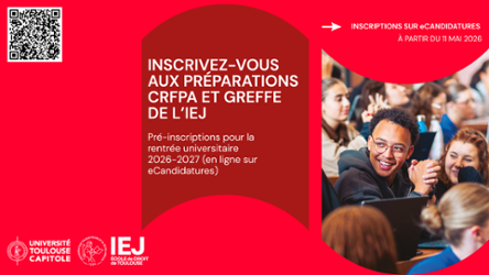 L’Institut d’Études Judiciaires de Toulouse ouvre les pré-inscriptions aux préparations GREFFE et CRFPA (à distance) pour la rentrée universitaire 2026-2027.