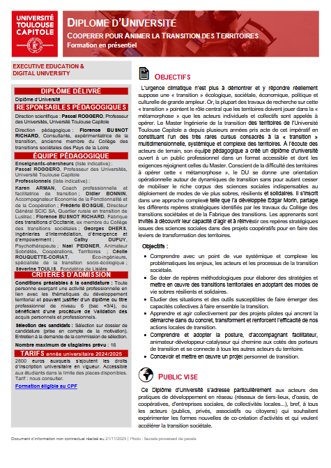 Le Master Ingénierie de la transition des territoires de l’Université Toulouse Capitole a depuis plusieurs années pris acte de cet impératif en constituant l’un des très rares cursus consacrés à la « transition » multidimensionnelle, systémique et complexe des territoires. À l’écoute des acteurs de terrain, son équipe pédagogique a créé un diplôme d’université ouvert à un public professionnel dans un format accessible et dont les exigences rejoignent celles du Master. Conscient de la difficulté des territoires à opérer cette « métamorphose », le DU se donne une orientation opérationnelle autour de dynamiques de transition sans pour autant cesser de mobiliser le riche corpus des sciences sociales indispensables au déploiement de modes de vie plus sobres, résilients et solidaires.