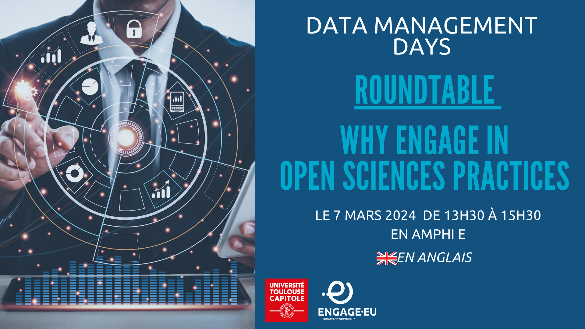 Dans le cadre des Data Managements Days organisés par ENGAGE.EU et le SCD, une table ronde vous est proposée sur les pratiques de l'Open Science le 7 mars de 13h30 à 15h30 en Amphi E.