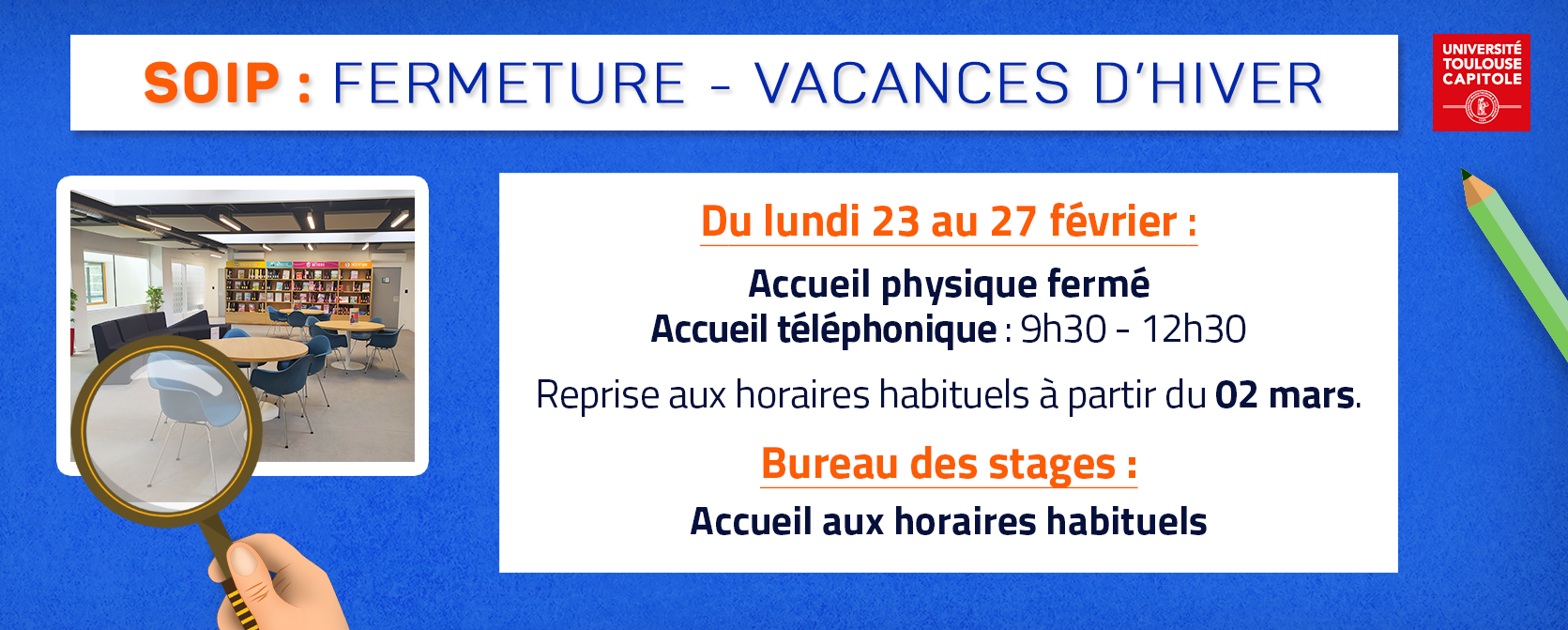 Le Service d'Orientation et d'Insertion Professionnelle (SOIP) accompagne les lycéens, étudiants et diplômés dans la construction de leur projet d'études et professionnel. Vous souhaitez vous informer sur les formations et les métiers, demander conseil, consulter les ressources documentaires ou prendre rendez-vous avec une psychologue de l'Education Nationale ?Venez nous rencontrer