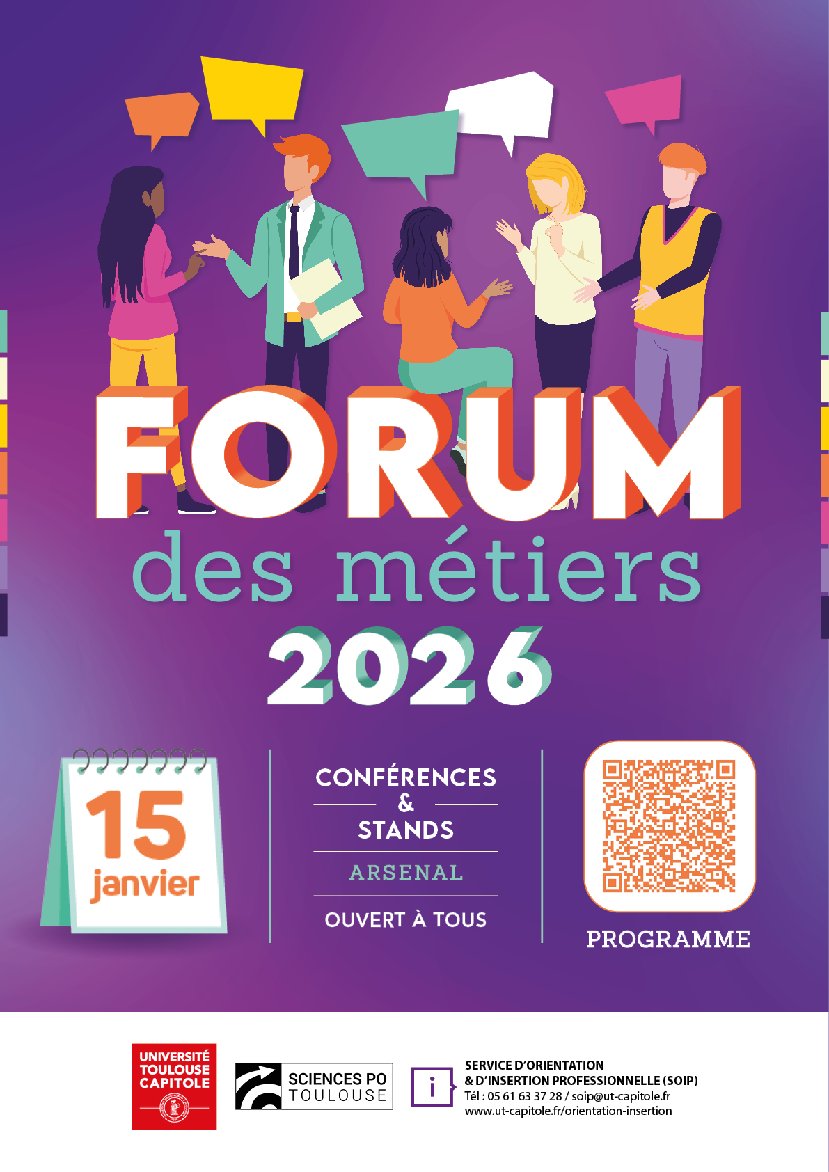 Rendez-vous le jeudi 15 janvier 2026 pour la nouvelle édition du Forum des Métiers ! Organisée pour tous les étudiants de l'Université Toulouse Capitole, une journée de 40 conférences et 50 stands pour rencontrer plus de 200 intervenants professionnels et découvrir les métiers accessibles après vos études. Evènement co-organisé avec Sciences Po Toulouse, l'Ecole de droit de Toulouse, la Faculté d'Administration et Communication et la Faculté d'Informatique.