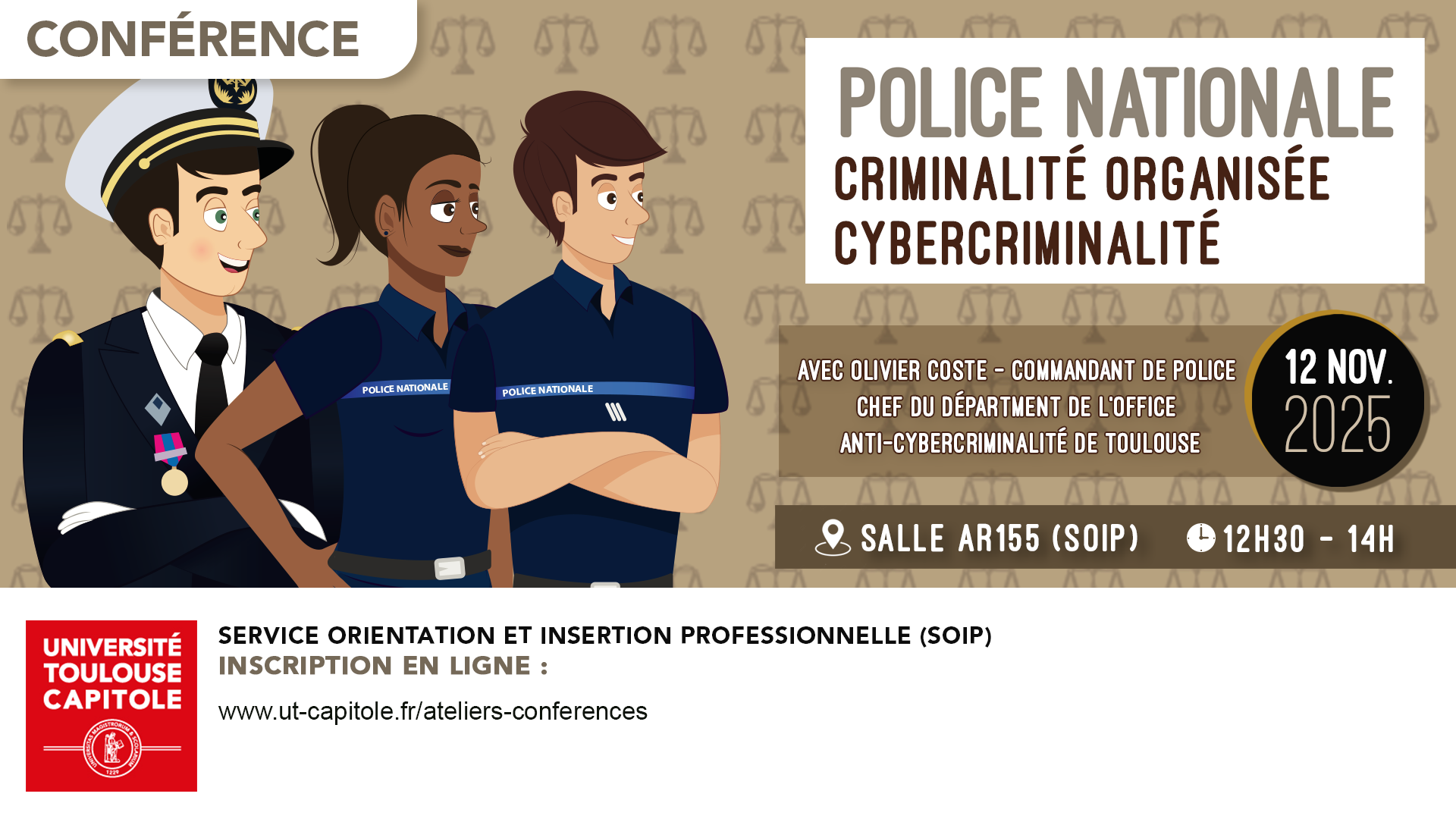 Diplômé de l'Université Toulouse Capitole, le Commandant Coste travaille au sein de la Police Judiciaire. Venez découvrir la Police Nationale de l'intérieur en écoutant son témoignage, son parcours, son quotidien, lors de cette conférence.