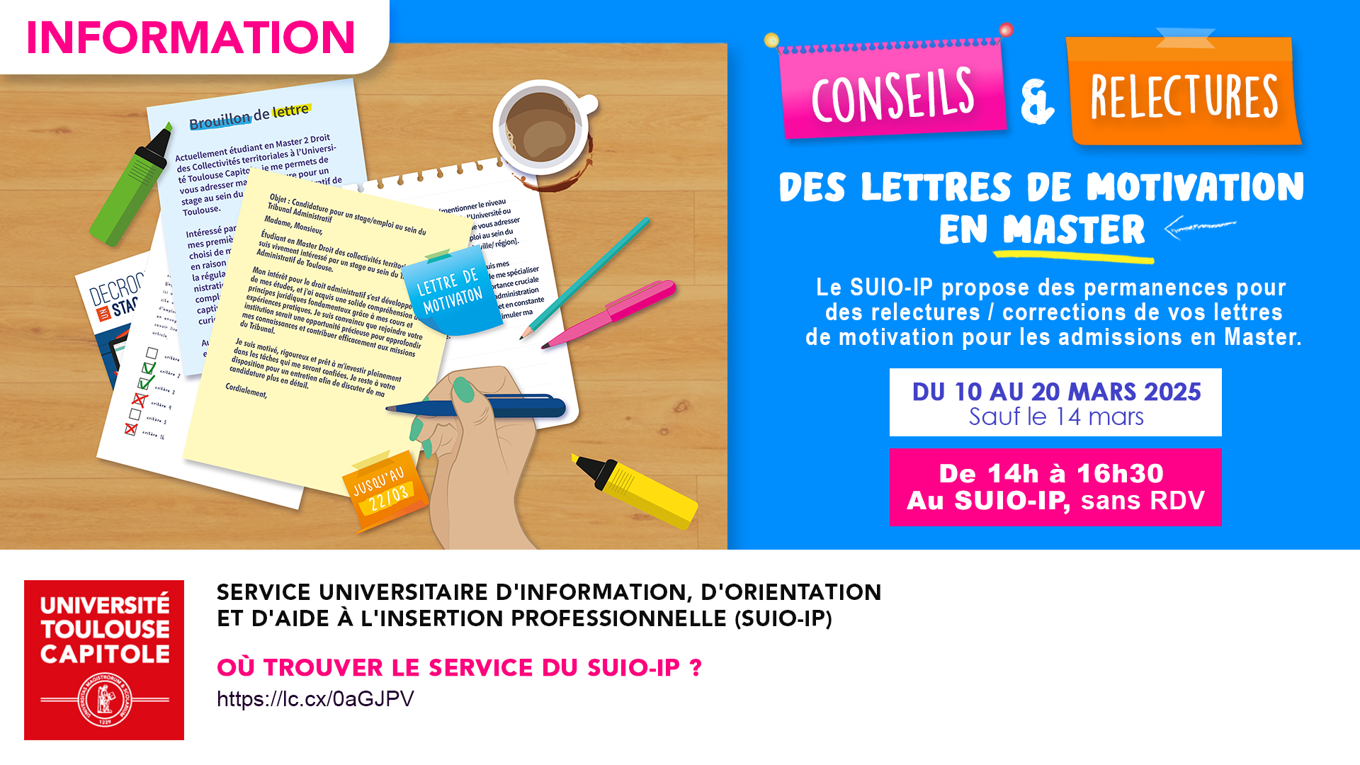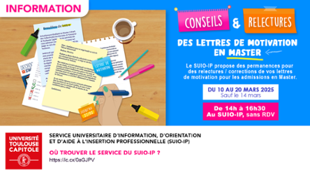 Des chargés d'orientation vous reçoivent sans rendez-vous pour une relecture de vos lettres de motivation pour les candidatures en Master, à l'accueil du SUIO-IP