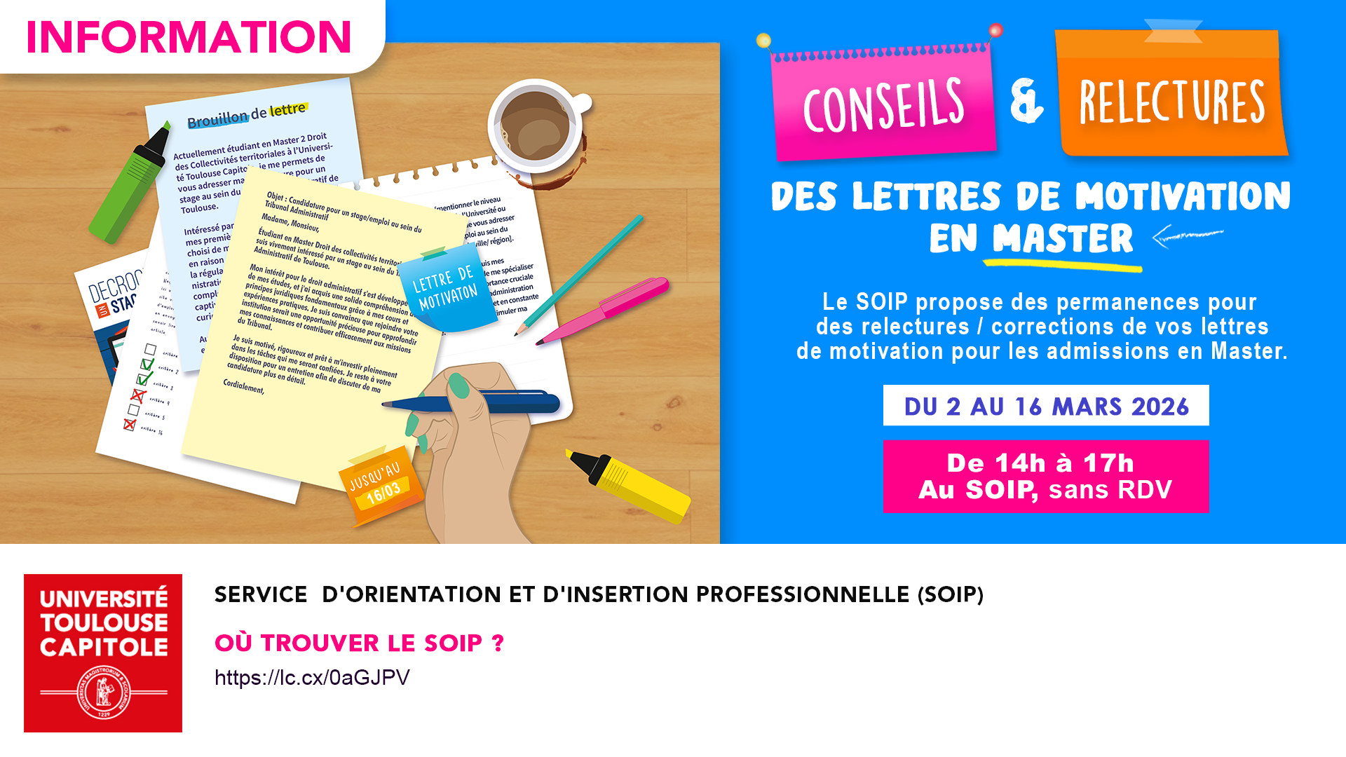 Des chargés d'orientation vous reçoivent sans rendez-vous pour une relecture de vos lettres de motivation pour les candidatures en Master, à l'accueil du SOIP