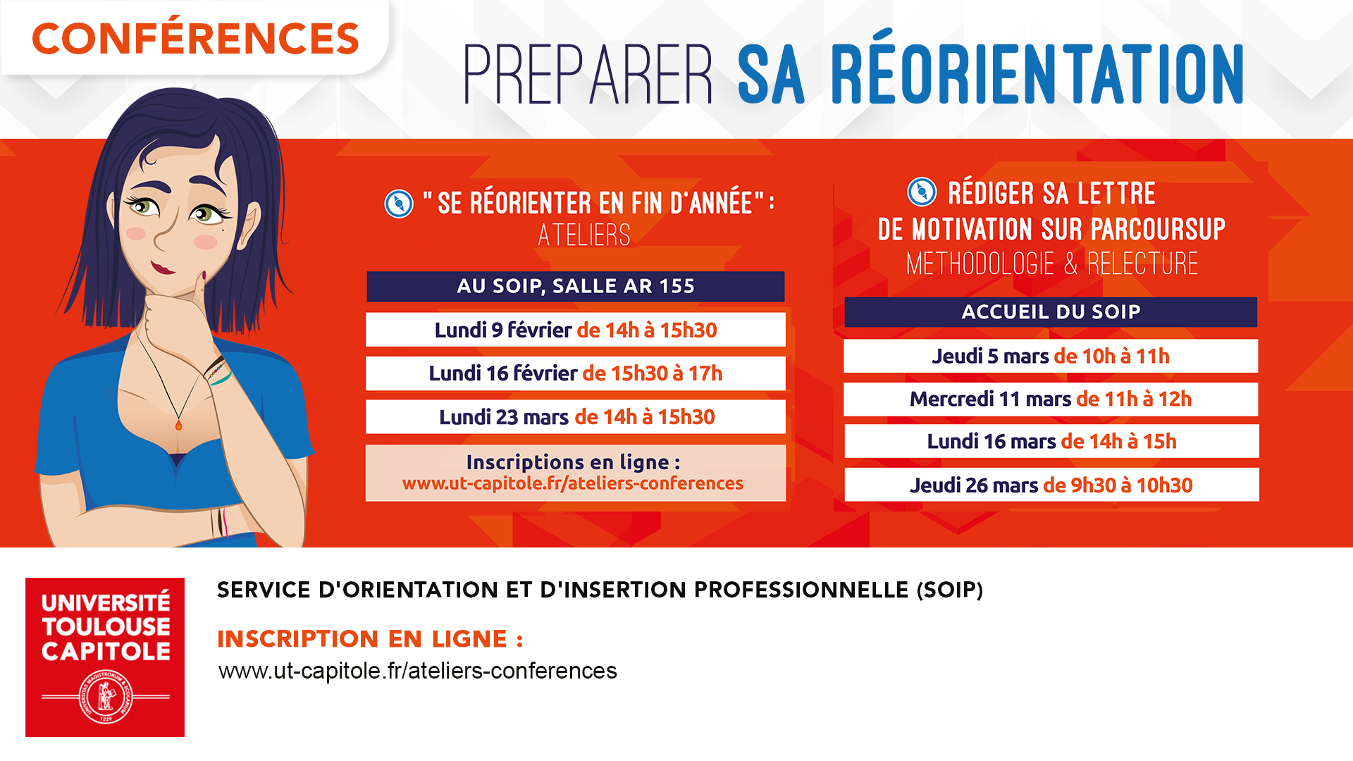 Sessions animées par des Psychologues spécialisées en orientation : informations et échanges sur les possibilités de réorientation, Parcoursup, passerelles, stages et alternance.