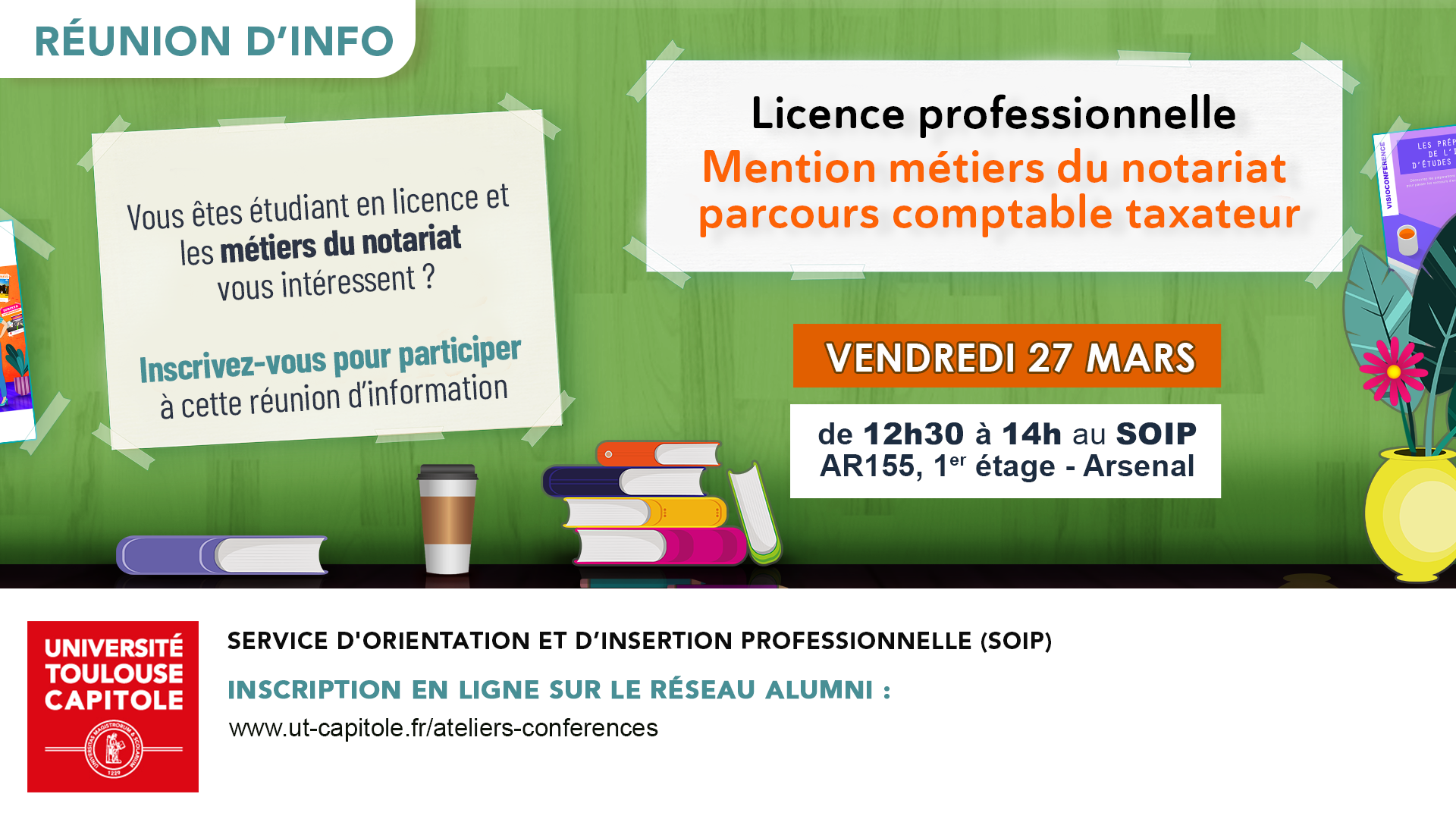 Vous êtes étudiant en licence et les métiers du notariat vous intéressent ? Inscrivez-vous pour participer à cette réunion d'informations le 27 mars à 12h30 au SOIP.