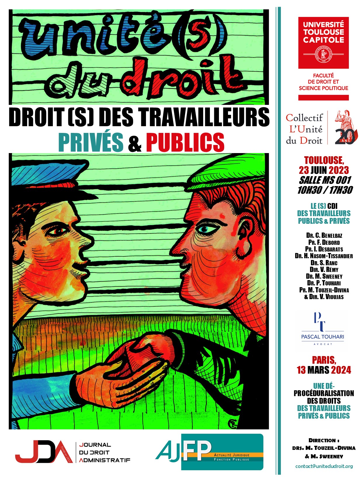 À l’initiative du Collectif L'Unité du Droit, un colloque portant sur "Le(s) CDI des travailleurs publics & privés" aura lieu le 23 juin 2023 à la Faculté de Droit de l’Université Toulouse Capitole. Les actes du colloque seront publiés en partenariat avec l’Actualité Juridique – Fonction Publique (AJFP) et le Journal du Droit Administratif (JDA).