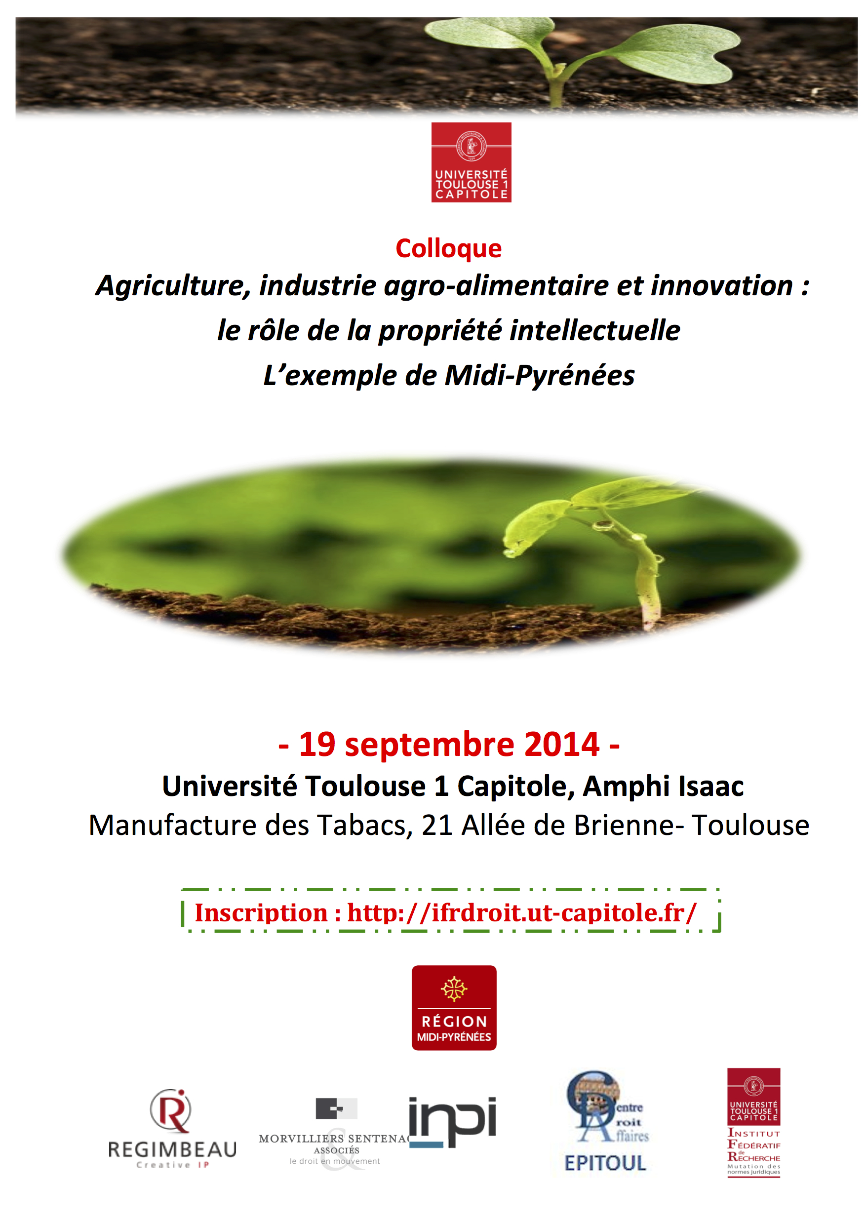 Ce colloque réunit des chercheurs de l’Université Toulouse Capitole (Professeurs et doctorants) et d’autres universités ou écoles, il associe des cabinets de propriété industrielle et d’avocats spécialisés ainsi que des professionnels du secteur de l’agro-alimentaire. Tous travailleront, autour de plusieurs tables rondes tout au long de la journée, à établir le rôle de la propriété intellectuelle dans l'agriculture, l'industrie agro-alimentaire et l'innovation.