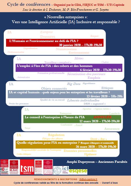 Le Centre de Droit des Affaires, en partenariat avec l’Institut des Études Juridiques de l’Urbanisme et de la Construction et Toulouse School of Management, organisent un cycle de conférences intitulé « Nouvelles entreprises : vers une IA inclusive et responsable ? ». Alors que l’intelligence artificielle est souvent envisagée au regard de ses applications (en matière de robotique, d’objets connectés ou de programmes apprenants), l’objectif est de l’envisager du point de vue des objectifs qui sont de plus en plus attendus d’elle, en termes d’éthique, d’inclusion et de responsabilité. Il s’agit plus précisément encore de s’interroger sur la façon dont l’entreprise peut contribuer à la réalisation de ce type d’objectifs mais aussi sur les leviers susceptibles d’être actionnés pour y parvenir.