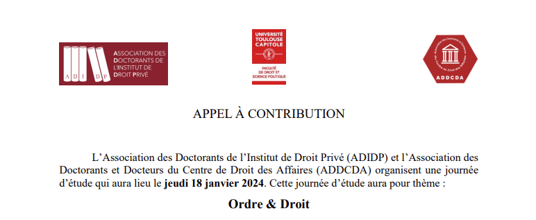 L'Association des Doctorants de Droit Privé (ADIDP) et l'Association des Doctorants et Docteurs du Centre de Droit des Afffaires (ADDCDA) organisent une journée d'étude qui aura lieu le jeudi 18 janvier 2024. Cette journée aura pour thème : Ordre & Droit.