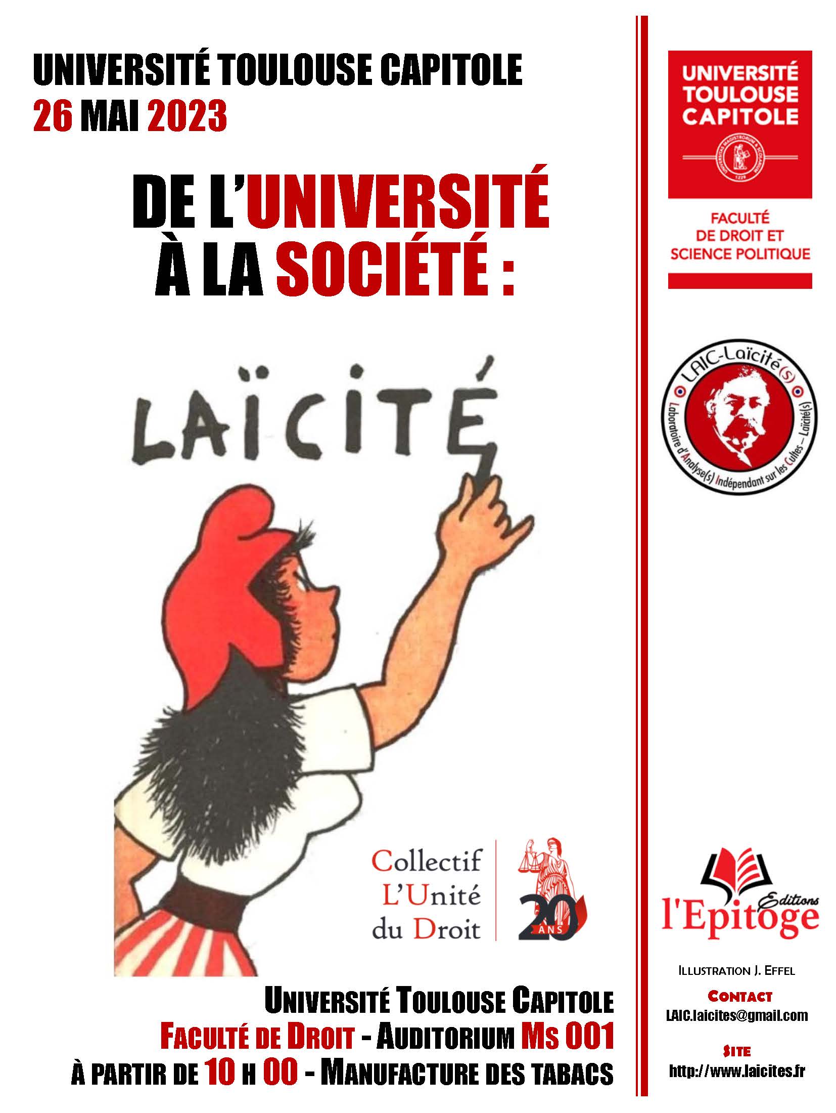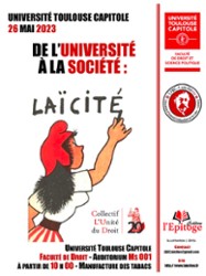 Il est proposé, à l’initiative d’un laboratoire scientifique universitaire et associatif de recherches, de confronter les points de vue(s) existant en matière de Laïcité appliquée dans un service public donné (l’Université) et dans l’espace public sociétal.Pour ce faire, dans un cadre académique (à l’Université Toulouse Capitole, Faculté de Droit) des membres de la communauté universitaire (étudiants, Biatss & personnels enseignants -chercheurs) seront d’abord invités à échanger sur les matérialisation et difficultés potentielles de la Laïcité à l’Université. Puis, après une pause méridienne, l’après-midi proposera non seulement différents points de vue sur les matérialisations de la Laïcité dans la société (les médias, la politique, la Justice, les associations, …) mais aussi des débats nourris.