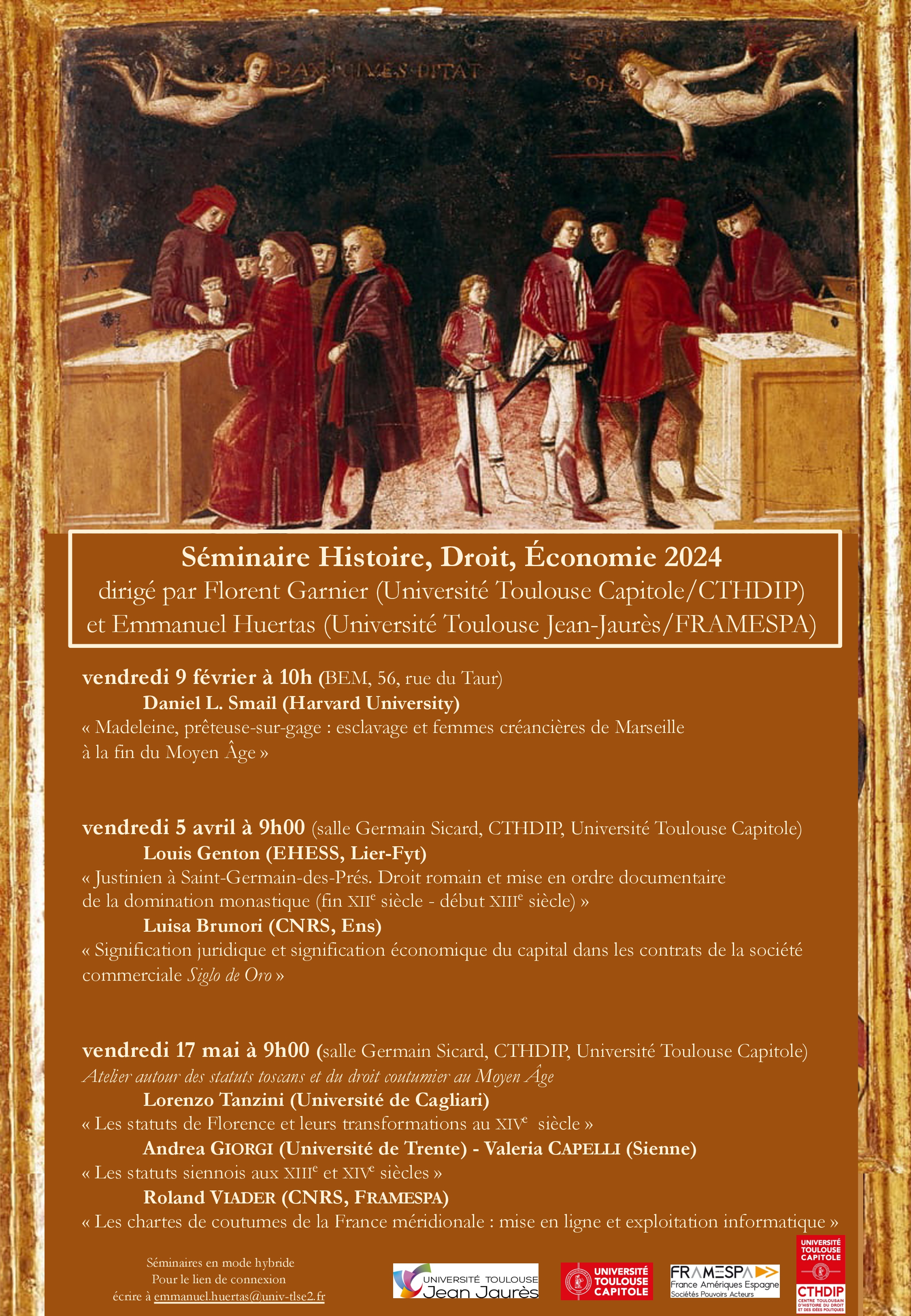 Le Centre Toulousain d’Histoire du Droit et des Idées Politiques (Université Toulouse Capitole) et le laboratoire FRAMESPA (Université Toulouse Jean-Jaurès) présentent le Séminaire Histoire Droit Économie. Ce séminaire a pour objet d’inviter des historiens ou des historiens du droit afin de présenter des travaux ayant une dimension économique et juridique dans la longue durée (Moyen Âge – époque moderne). Une attention particulière est donnée aux typologies documentaires et à la présentation des corpus de sources. L’approche est interdisciplinaire destinée à renforcer le dialogue scientifique entre chercheurs d’établissements toulousains dans une dimension européenne et internationale.