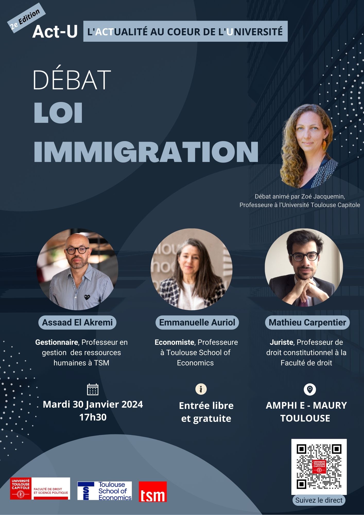 UT Capitole, forte de la recherche de ses facultés, instituts et écoles de renom, lance une série de débats interdisciplinaires permettant d'éclairer des sujets d’actualité. Après une première édition consacrée à la réforme des retraites, « Act-U » revient sur la loi immigration pour cette deuxième édition de l’Actualité au cœur de l’Université.