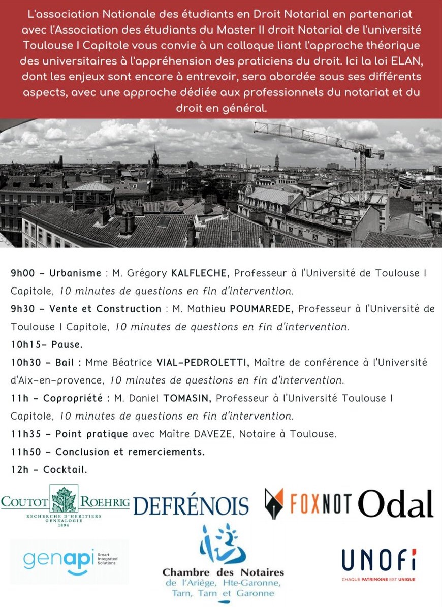 L'association Nationale des étudiants en Droit Notarial en partenariat avec l'Association des étudiants du Master II droit Notarial de l'université Toulouse 1 Capitole vous convie à un colloque liant l'approche théorique des universitaires à l'appréhension des praticiens du droit.