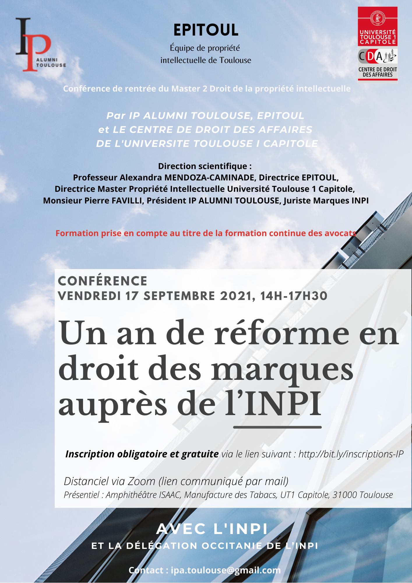 La direction scientifique de la conférence est assurée par le professeur Alexandra MENDOZA-CAMINADE (Directrice équipe EPITOUL-CDA, Directrice Master Droit de la Propriété Intellectuelle, Université Toulouse 1 Capitole), Et monsieur Pierre FAVILLI (Juriste Marques INPI, Président IP ALUMNI TOULOUSE).
