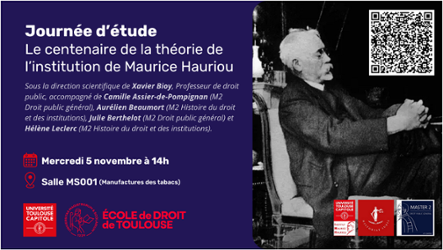 Le Master Droit public Général et le master Histoire du droit et des institutions de l'École de Droit de Toulouse, organisent une journée d’étude consacrée au centenaire de la théorie de l'institution de Maurice Hauriou, sous la direction scientifique de Xavier Bioy, Professeur de droit public à l'École de Droit de Toulouse et membre de l’EDT-R (IMH), accompagné de Camille Assier-de-Pompignan (M2 Droit public général), Aurélien Beaumort (M2 Histoire du droit et des institutions), Julie Berthelot (M2 Droit public général) et Hélène Leclerc (M2 Histoire du droit et des institutions). Découvrez le programme !