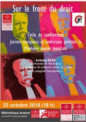 Lorsque la Grande Guerre éclate, l’idéologie de la « Guerre du Droit » gagne tous les milieux et devient l’un des principaux arguments dans la justification de cet enfer de plusieurs millions de morts. Au sein de cette guerre totale engageant l’ensemble des grandes puissances mondiales, un autre front se constitue, celui de la propagande internationale. Les combats y sont menés par ceux de l’arrière, ceux exonérés de l’« impôt du sang », ayant pour armes le poids des mots, la force de la rhétorique et la capacité de persuasion attachée à leur charisme et à leur prestige. En première ligne, à côté des intellectuels influents de l’époque, les juristes-universitaires mobilisent leurs savoirs et utilisent les réseaux de cette diplomatie parallèle pour faire valoir le bien-fondé de la cause française auprès des neutres et des alliés. Ambassadeurs de la science juridique française, plusieurs membres de cette élite savante prennent part à la guerre d’opinion contre les empires monarchiques de l’Axe pour imposer au reste du monde leur histoire et leur vérité sur les événements. Plusieurs d’entre eux sont envoyés en mission pour vanter la supériorité de la civilisation française face à la Kultur allemande, expression de la barbarie et de la folie d’une « nation de proie », et pour exhorter les populations à rejoindre la lutte du « Droit contre la Force ».