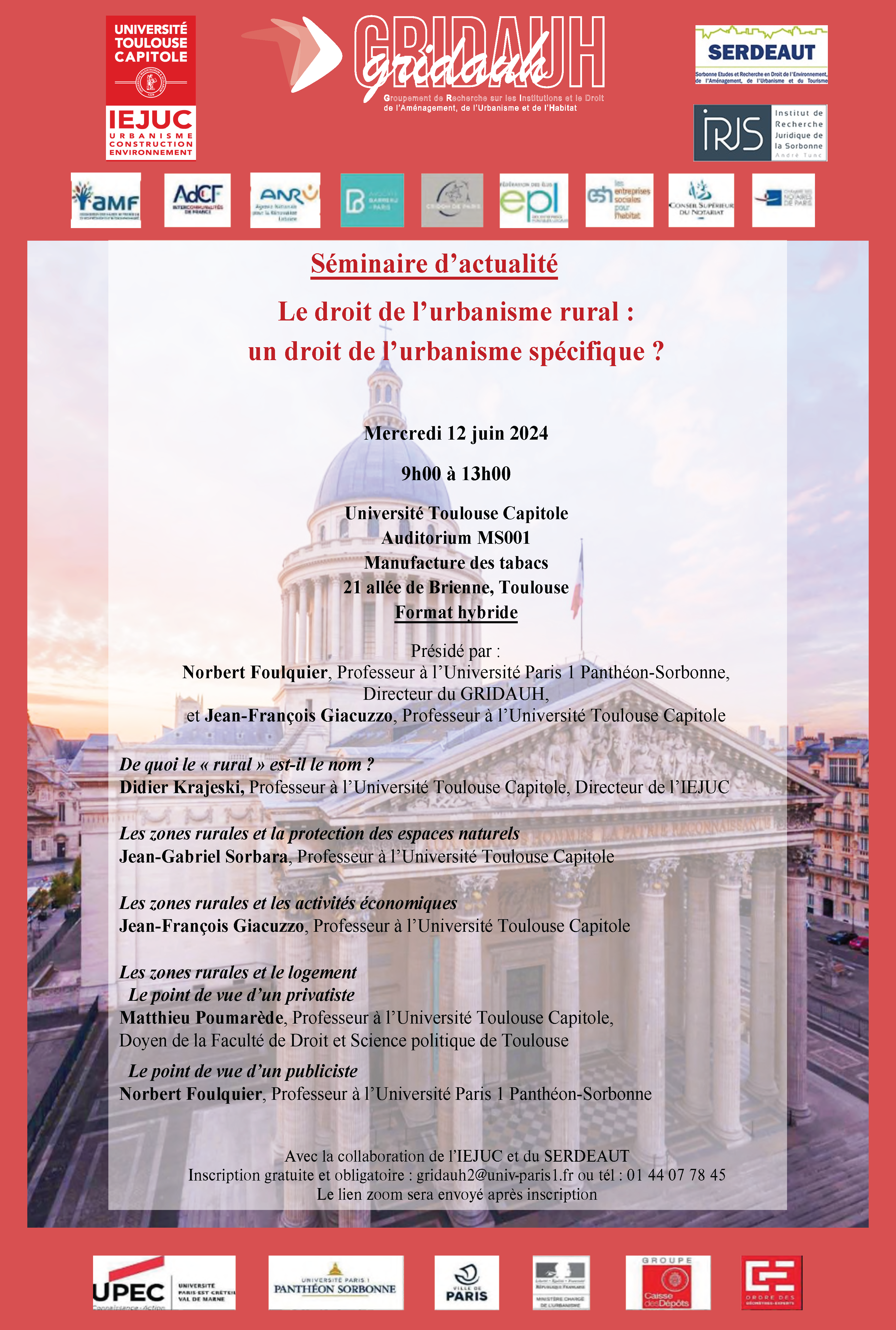 Institut des Etudes Juridiques de l'Urbanisme, de la Construction et de l'environnement (IEJUC) d'UT Capitole organise en partenariat avec le Groupement de Recherche sur les Institutions et le droit de l'Aménagement, de l'Urbanisme et de l'Habitat (GRIDAUH), un séminaire d'actualité sur la thématique "le droit de l'urbanisme rural : un droit de l'urbanisme spécifique ?"