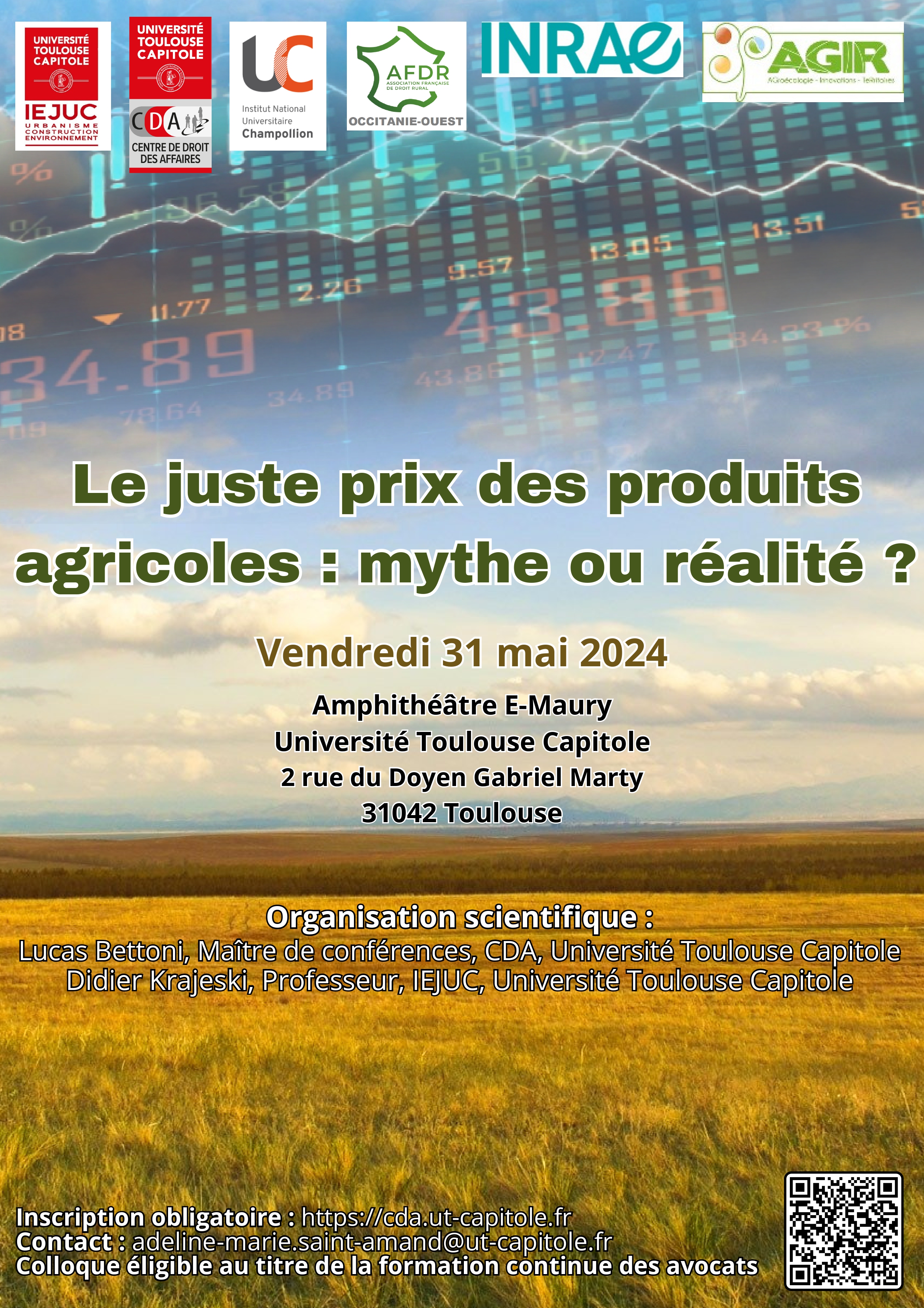 Le colloque sur "le juste prix des produits agricoles : mythe ou réalité?" aura lieu le vendredi 31 mai à UT Capitole. Il est organisé par le Centre de Droit des Affaires (CDA) et l'Institut des Études Juridiques de l'Urbanisme, de la Construction et de l'Environnement (IEJUC)