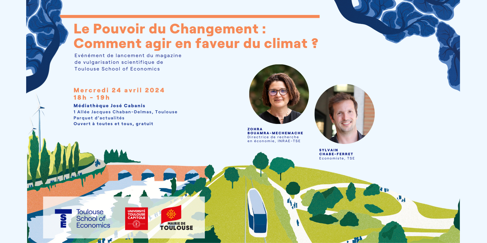Venez rencontrer Zohra Bouamra-Mechemache, directrice de recherche en économie TSE-INRAE, et Sylvain Chabé-Ferret, économiste à TSE, également membre de l'INRAE. Ils partageront leurs connaissances sur le thème du climat, sujet central du dernier magazine de vulgarisation scientifique, le TSE Mag.