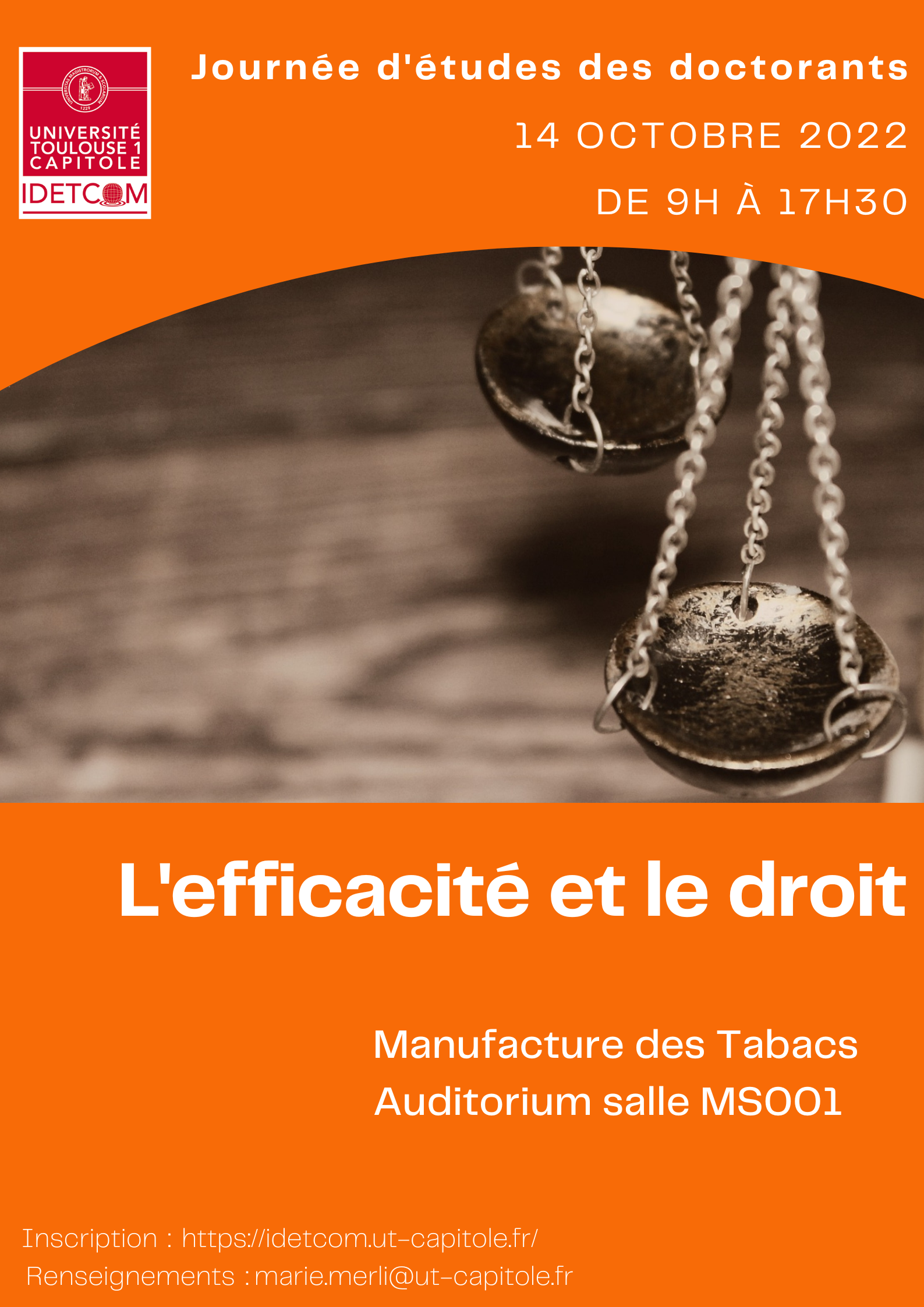 La journée d’études organisée par les doctorants et doctorantes de l'Institut du Droit de l'Espace, des Territoires, de la Culture et de la Communication (IDETCOM. EA 785) sera l'occasion d'interroger la notion d'efficacité en Droit et certaines de ses manifestations.