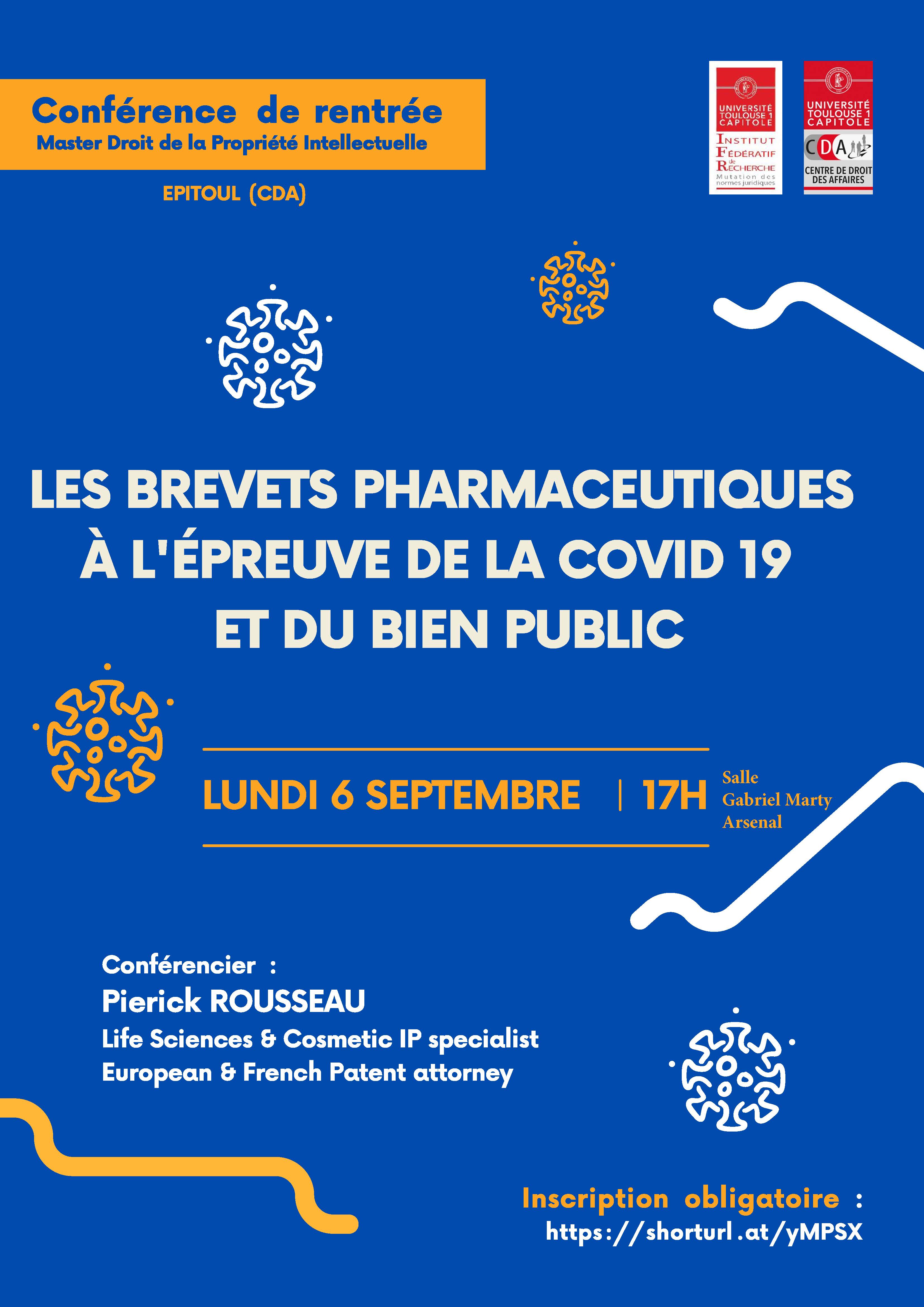 "Les brevets pharmaceutiques à l'épreuve de la Covid 19 et du bien public", conférence de rentrée du Master Droit de la Propriété Intellectuelle