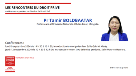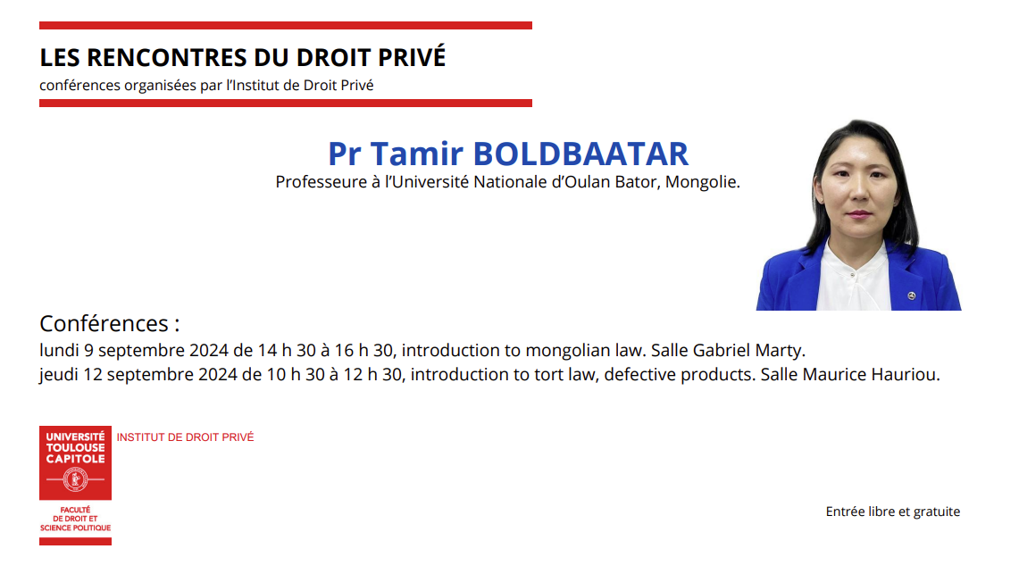 L'Institut de Droit Privé de l'Université Toulouse Capitole a l'honneur de recevoir du 9 au 13 septembre 2024, Mme Tamir BOLDBAATAR, professeur de l’université nationale d’Oulan Bator en Mongolie.