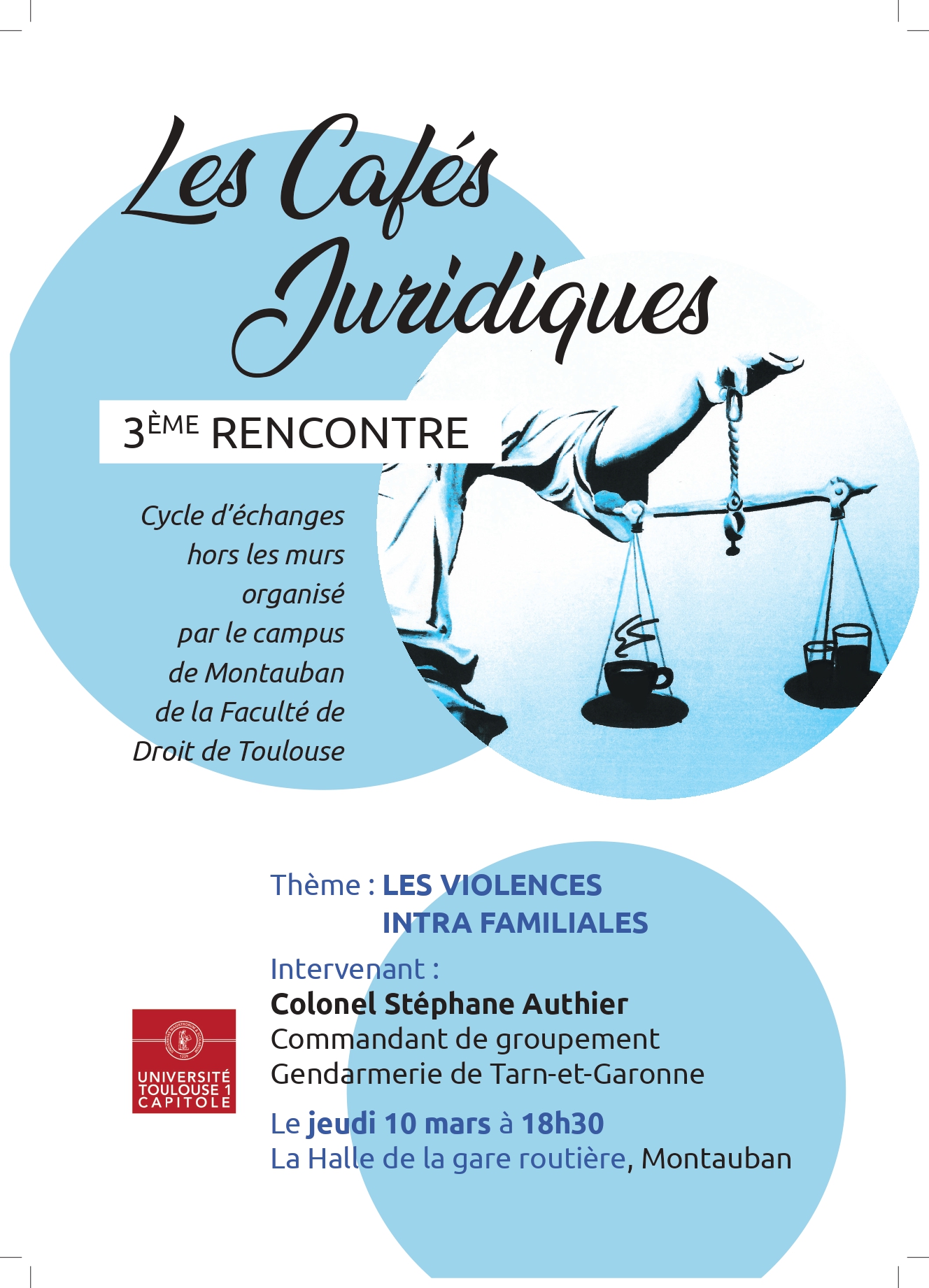 La troisième rencontre des Cafés juridiques organisés par le campus de Montauban aura lieu le 10 mars 2022, sur le thème "Les violences intra-familiales".