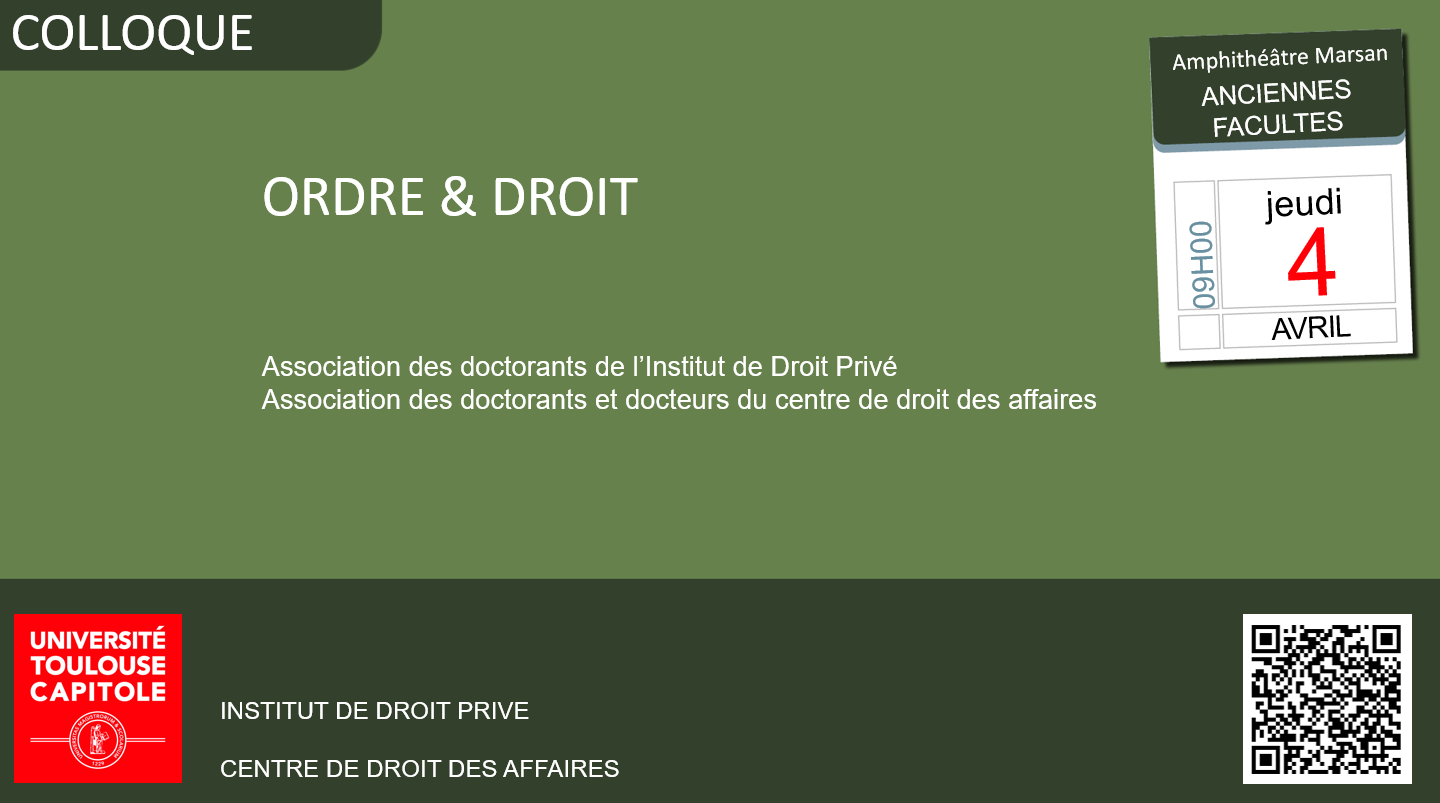 L’association des doctorants de l’Institut de Droit Privé et l’association des doctorants et docteurs du centre de droit des affaires organisent une conférence sur la thématique de l’ordre et du droit.
