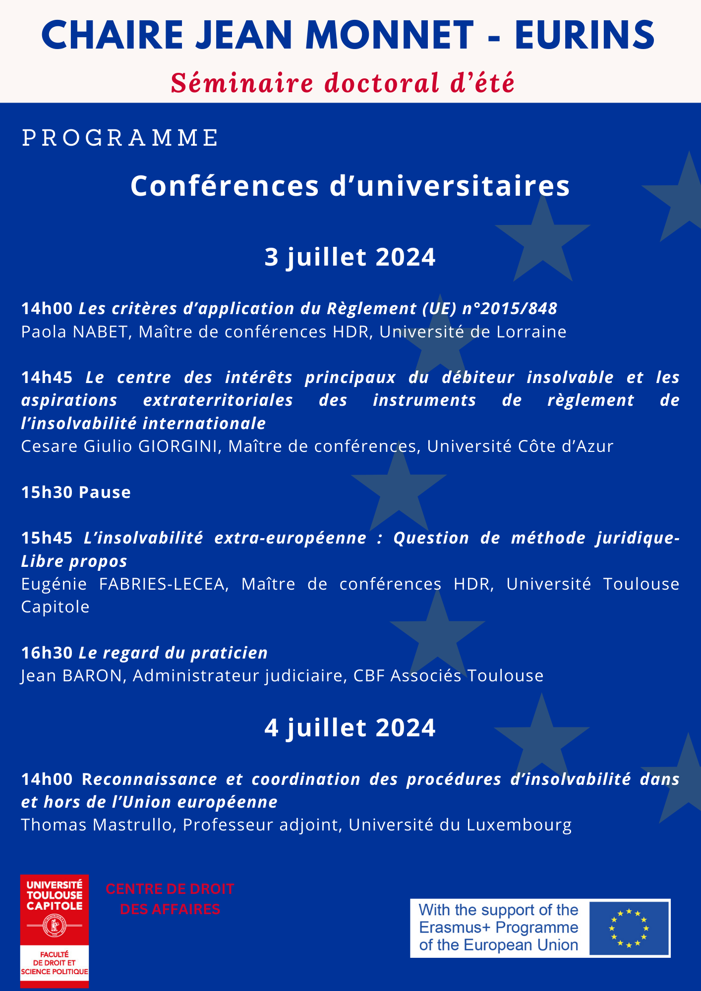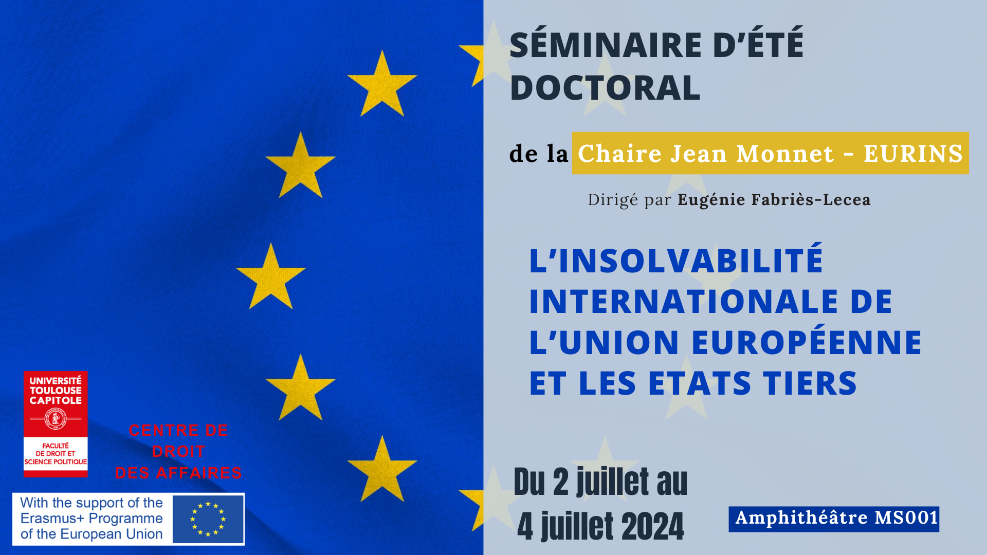 Le Séminaire doctoral d'été de la Chaire Jean Monnet - EURINS, dirigé par Eugénie Fabriès-Lecea aura lieu du 2 juillet au 4 juillet 2024 dans l'Amphithéâtre MS001. Il portera sur le droit de l'insolvabilité internationale de l'Union européenne et les États tiers.