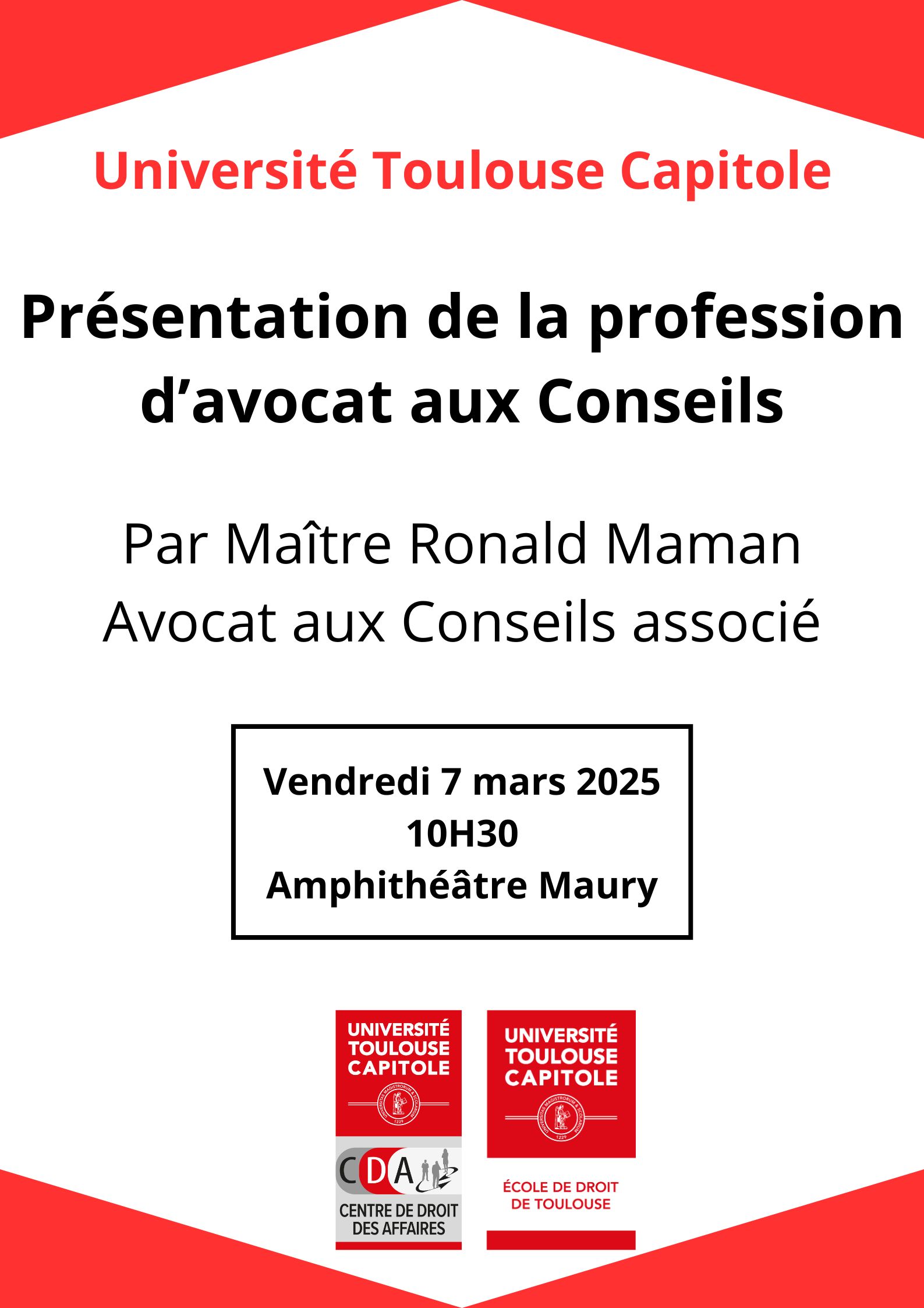 Le vendredi 7 mars prochain à partir de 10h30, Ronald Maman, avocat aux Conseils associé, fera une présentation de la profession d'avocat aux Conseils.