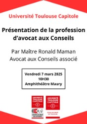 Le vendredi 7 mars prochain à partir de 10h30, Ronald Maman, avocat aux Conseils associé, fera une présentation de la profession d'avocat aux Conseils