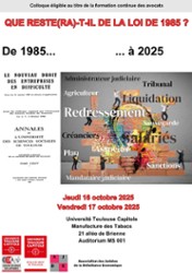 Le colloque "Que reste(ra)-t-il de la loi de 1985 ?" aura lieu les jeudi 16 et vendredi 17 octobre 2025 à UT Capitole. Il est organisé par le Centre de Droit des Affaires (CDA) et l’Association des Juristes de la Défaillance Économique (AJDE).